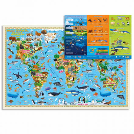 Эта ДВУХСТОРОННЯЯ настенная карта отлично подойдёт для первого знакомства ребёнка с многообразием животных, птиц, а также растений нашей планеты. Яркие и красочные иллюстрации увлекут на долгое время маленького исследователя, позволив в полной мере представить, как богата природа Земли. На оборотной стороне карты приведена инфографика, с её помощью дети узнают, какое животное самое быстрое на земле, а какое самое высокое и ещё много полезной и интересной информации. Удобный формат карты позволит расположить её на стене или на рабочем столе ребёнка, чтобы она всегда была под рукой, например, при подготовке домашних заданий.| Издательство | ГеоДом ООО |