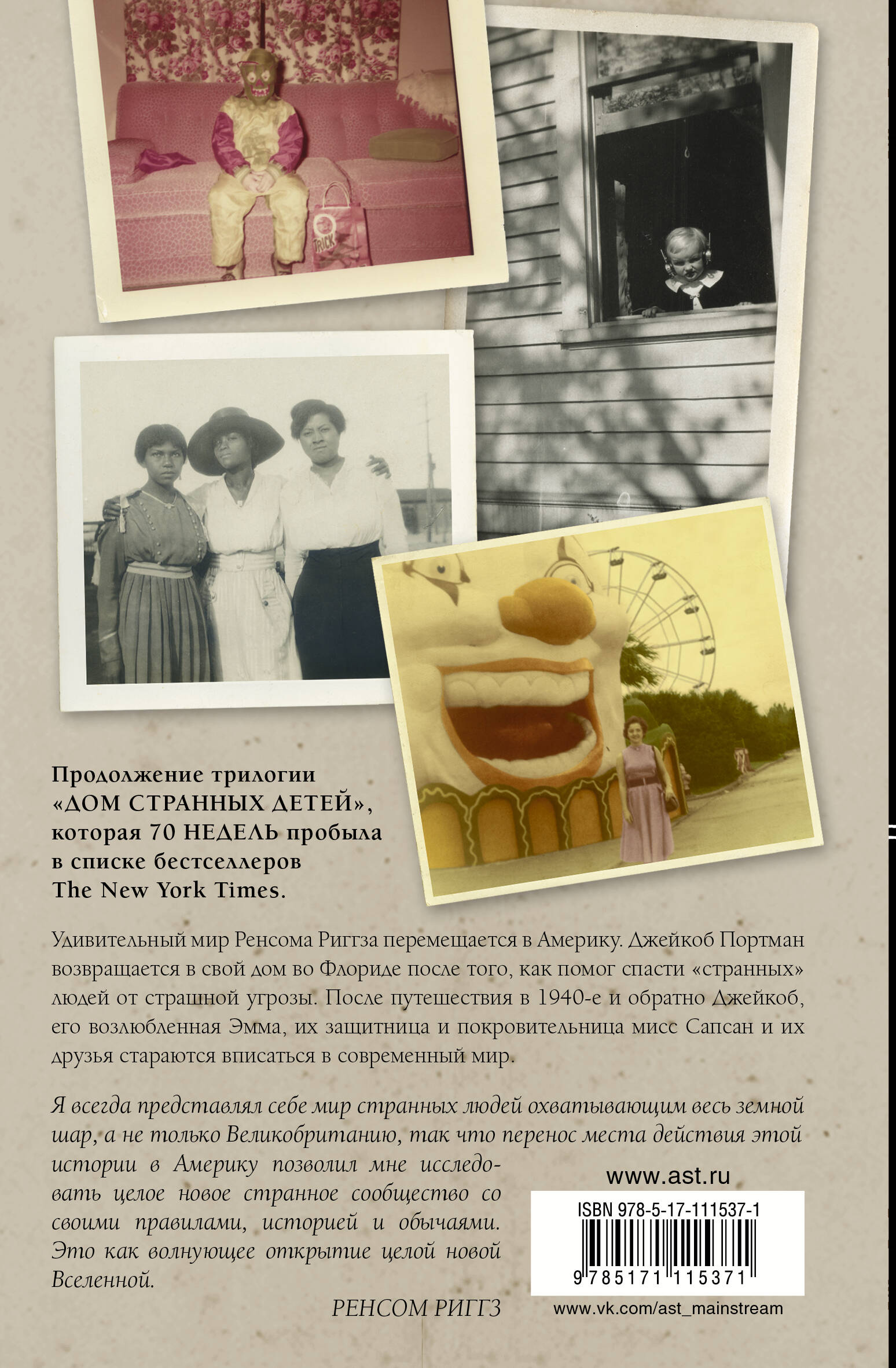 Четвертая книга из серии «Дом мисс Сапсан для странных детей». Серия-бестселлер №1 по спискам «Нью-Йорк Таймс». Прекрасный новый мир! Новые невообразимые опасности! Приключения только начинаются! «Напряженная, трогательная и чарующе странная… Фотографии в сочетании с текстом создают великолепную, незабываемую историю». - Джон Грин, автор книг «Черепахи - и нет им конца» и «Виноваты звезды», о серии «Дом мисс Сапсан для странных детей». Об авторе Рэнсом Риггз - автор серии романов «Дом мисс Сапсан для странных детей», занимающей первое место в списках серий-бестселлеров «Нью-Йорк Таймс». Риггз родился на ферме в Мэриленде и вырос на юге Флориды. Он изучал литературу в Кэньон-колледже и закончил кинематографический факультет Университета Южной Калифорнии. Сейчас он живет в Лос-Анджелесе со своей женой Тахирой Мафи, которая тоже пишет книги-бестселлеры.| Издательство | Издательство "АСТ" |