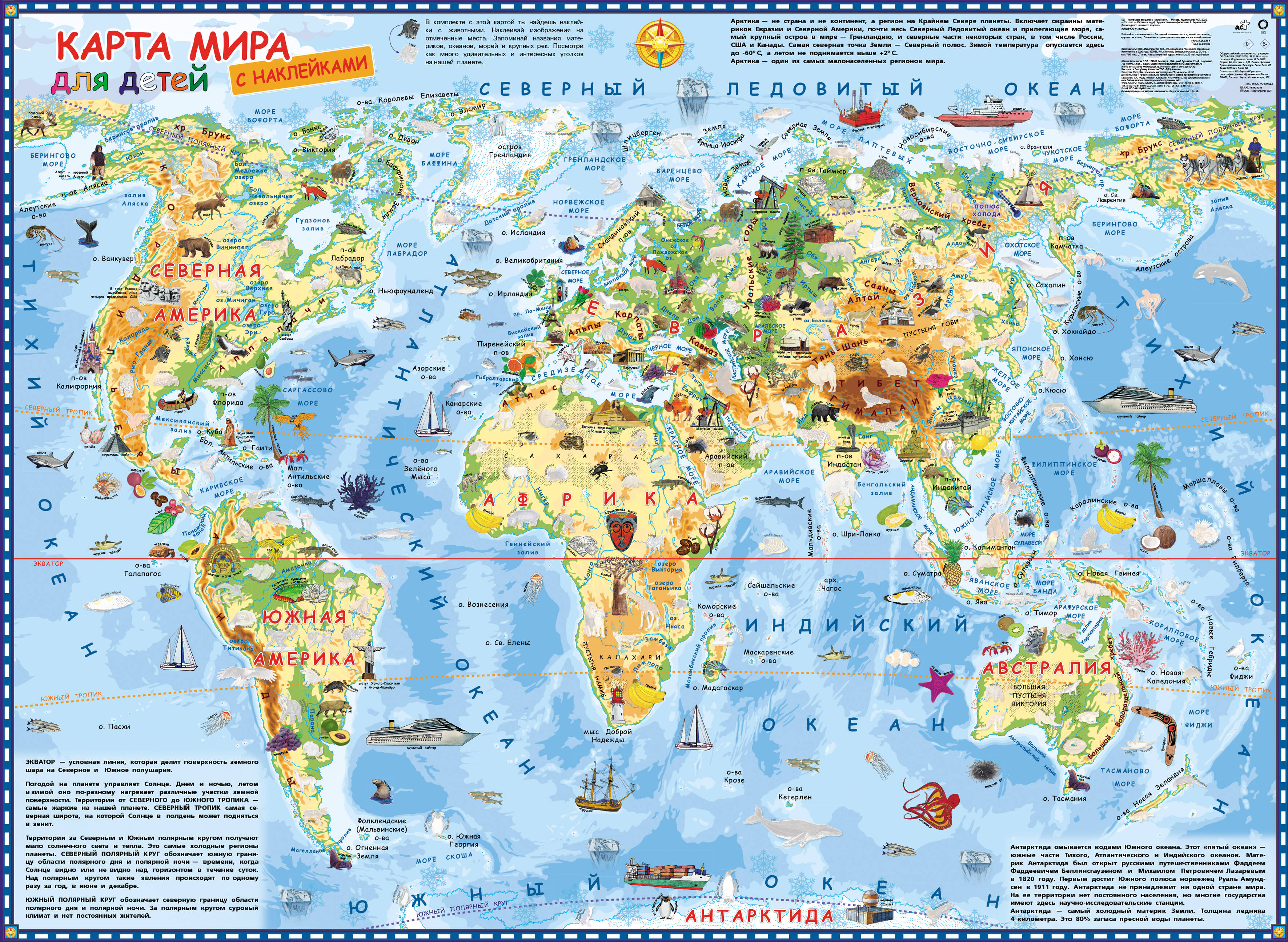 Побывай на всех континентах. Познакомься с уникальным животным миром нашей планеты. Запоминай названия материков и океанов, морей, высоких гор и крупных рек. Формат карты позволяет увидеть весь мир, запомнить очертания и соотношение материков. В комплекте с картой прилагается лист со 162 наклейками. Для каждого изображения на карте отмечено место для наклеивания. Картой удобно пользоваться - ее можно расстелить на полу или повесить на стену. При аккуратном наклеивании изображений животных на карту, она станет украшением интерьера детской. Надписи на карте даны крупным шрифтом. Рекомендуем детям от 4 лет. Игровые занятия с нашей картой расширяют кругозор и словарный запас, тренируют память, внимание, наблюдательность, смекалку и творческие способности.| Издательство | Издательство "АСТ" |