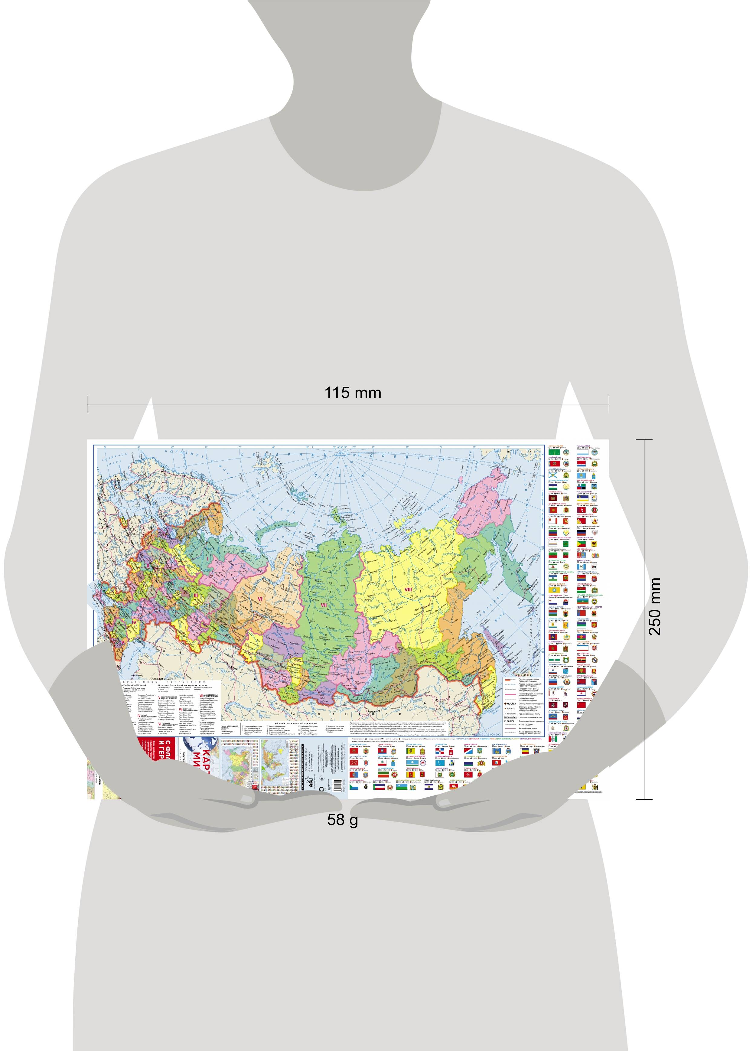 Складная карта содержит политическую карту мира и политико-административную карту России, карта дополнена флагами, гербами и справочной информацией с указанием площади территорий, численности населения, столиц и центров государств мира и субъектов РФ. На одной стороне листа - «Политическая карта мира» масштаба 1:40 000 000 (в 1 см 400 км). На карте представлены все 196 независимых государств мира с их столицами, а также зависимые территории и территории с особым статусом. Населённые пункты на карте даны в трёх градациях численности: более 1 млн жителей, от 100 тыс. до 1 млн, менее 100 тыс. жителей. Карта обрамлена официальными флагами и гербами государств мира, расположенными в алфавитном порядке, что облегчает их поиск. Названия государств выделены разными цветами, обозначающими части света. На другой стороне листа - карта «Федеративное устройство России» в масштабе 1:9 000 000 (в 1 см 90 км). На карте представлены 89 субъектов Федерации с их столицами и центрами. Границы Российской Федерации отражены на основании Федеральных конституционных законов от 04.10.2022 (№№ 5-ФКЗ, 6-ФКЗ, 7-ФКЗ, 8-ФКЗ) о принятии в Российскую Федерацию и образовании в составе Российской Федерации новых субъектов: Донецкой Народной Республики, Луганской Народной Республики, Запорожской и Херсонской областей. Субъекты РФ сгруппированы по 8 федеральным округам. Численность населения городов и посёлков дана по 6 градациям. Показаны магистральные пути железнодорожного и автомобильного сообщения. Карта обрамлена флагами и гербами, представленными в алфавитном порядке, названия субъектов РФ выделены разными цветами, обозначающими принадлежность к федеральным округам. Рекомендовано для широкого круга пользователей.| Издательство | ИЗДАТЕЛЬСТВО "АСТ" |