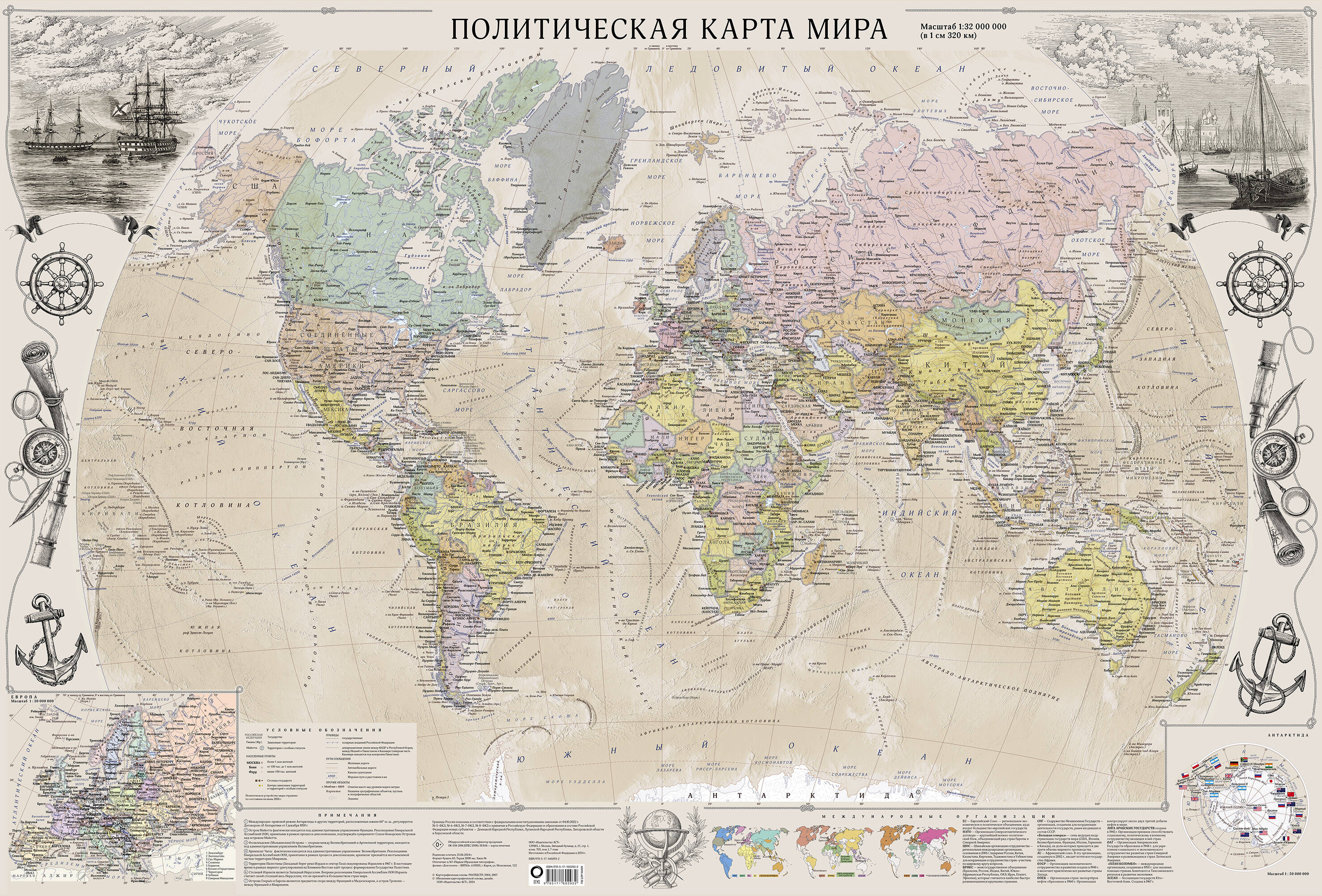 Карта в ПВХ-тубусе. Односторонняя настенная карта размером 1170х790 мм, масштаб 1:32 000 000 (в 1 см 320 км). На Политической карте представлены все независимые государства мира, включая Россию в новых границах, а также владения и территории с особым статусом. Хорошо различимыми пунсонами показаны населённые пункты с градациями «более 1 млн жителей», «от 100 тыс. до 1 млн жителей» и «менее 100 тыс. жителей». Основную карту дополняет врезка в более крупном масштабе на Европу. Карта стилизована под старинное издание, оформление в ретро-стиле не мешает восприятию картографической информации, цвета, в которые раскрашены страны и океаны, сохраняют читаемость карты. Карта мира под старину украсит стену и станет полезным информационным акцентом в вашем интерьере.| Издательство | Издательство "АСТ" |