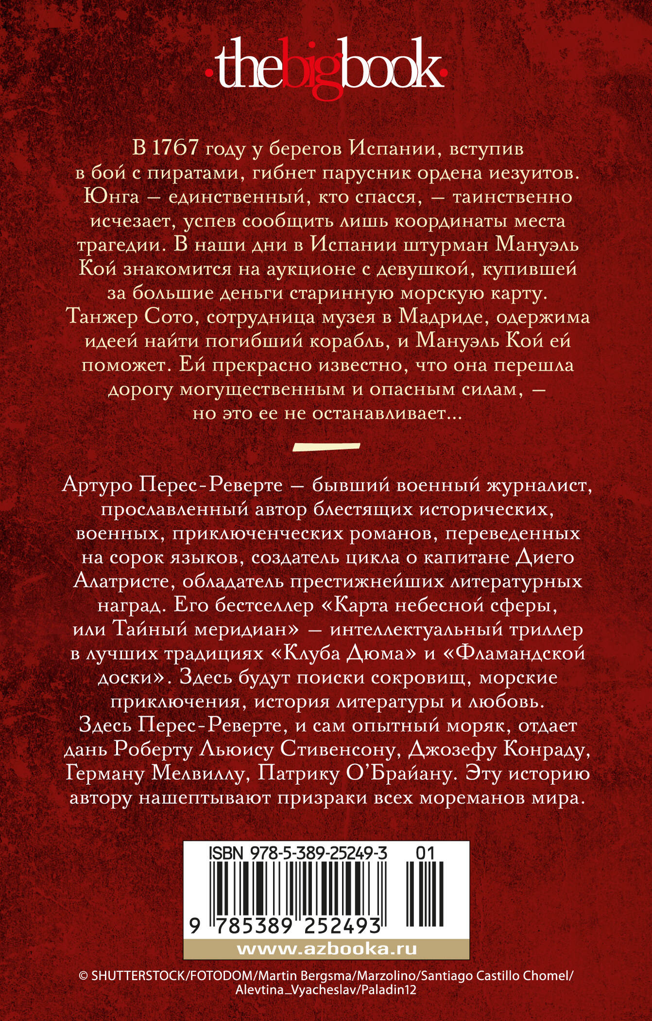 1767 год, февраль. Близ берегов Испании, вступив в бой с пиратами, гибнет парусник "Деи Глория", принадлежащий ордену иезуитов. Юнга - единственный, кто спасся, - таинственно исчезает, не успев толком рассказать о случившемся. Все, что он успел сообщить, - координаты места трагедии... Испания, наши дни. Штурман Мануэль Кой, на время лишенный права заниматься судовой деятельностью за то, что посадил судно на мель, знакомится на аукционе с девушкой, купившей за большие деньги старинную морскую карту. Танжер Сото, сотрудница музея в Мадриде, маниакально одержима идеей найти погибший корабль, шедший, как она полагает, с грузом чрезвычайной важности. Мануэля Коя она берет в помощники как опытного специалиста по навигации. Девушке прекрасно известно, что она перешла дорогу могущественным и опасным силам, способным пойти на все, только бы устранить соперницу, - но это ее не останавливает… Артуро Перес-Реверте - бывший военный журналист, прославленный автор блестящих исторических, военных, приключенческих романов, переведенных на сорок языков, создатель цикла о капитане Диего Алатристе, обладатель престижнейших литературных наград. Его бестселлер "Карта небесной сферы, или Тайный меридиан" - интеллектуальный триллер в лучших традициях "Клуба Дюма" и "Фламандской доски". Здесь витают призраки всех мореманов мира. Здесь Перес-Реверте, и сам опытный моряк, отдает дань Роберту Льюису Стивенсону, Джозефу Конраду, Герману Мелвиллу, Патрику О'Брайану. Здесь морские приключения неотделимы от истории, литературы и любви.| Издательство | Азбука-Аттикус Издат.группа ООО |