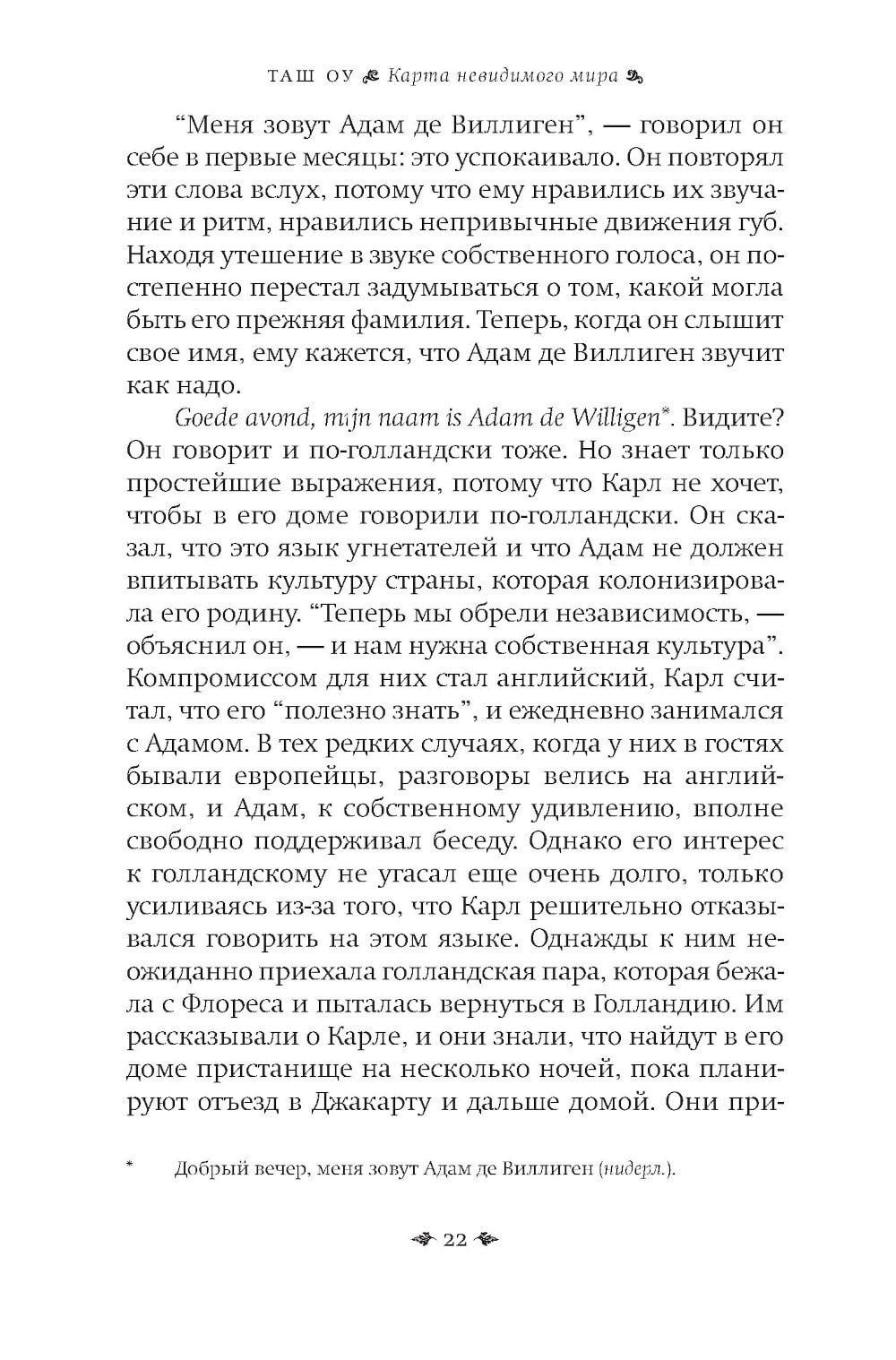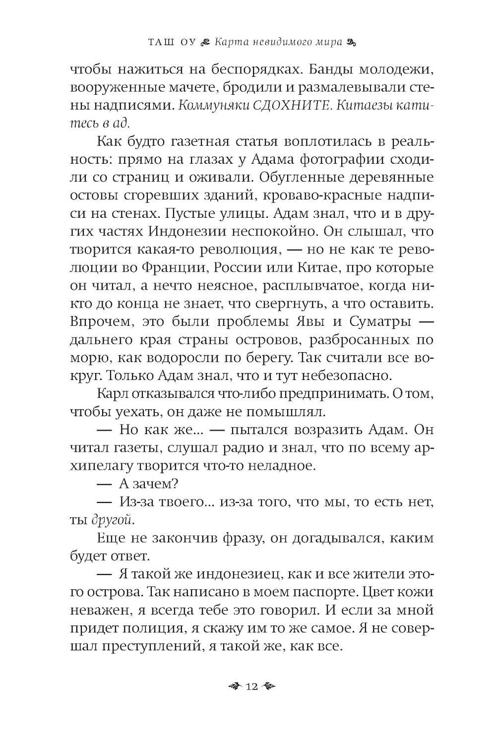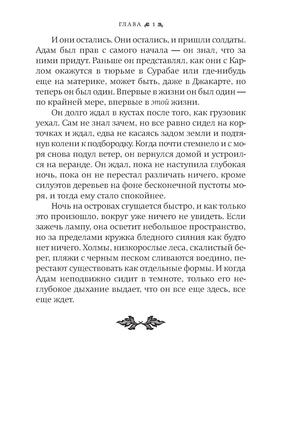 История о судьбах, которые переплетены с призрачными картами прошлого, - о том, как человек ищет себя через забвение и разлуку. Шестнадцатилетний Адам - трижды сирота: мать бросила мальчика и его старшего брата Джохана, потом его покинул Джохан, которого усыновили, и Адам остался совсем один, пока его не забрал к себе голландец Карл, который стал мальчику приемным отцом и увез его на идиллический отдаленный индонезийский остров. Когда Карла арестовывают на фоне политических волнений в Индонезии 1960-х годов, Адам вновь остается один и отправляется в Джакарту, чтобы найти приемного отца. Параллельно развивается история Джохана. Он живет в богатой приемной семье Малайзии и пытается справиться с чувством чуждости, которое никогда не покидает его, разобраться с давним детским своим предательством, когда он оставил младшего брата. Поиски Адама приводят его к Маргарет - американской преподавательнице, которая станет его проводником в хаотичном аду Джакарты. «Карта невидимого мира» - книга о памяти, идентичности, братской любви, предательстве и искуплении. Это роман о том, что некоторые миры невидимы, но именно они формируют наши жизни, отношения и решения.| Издательство | Фантом Пресс |