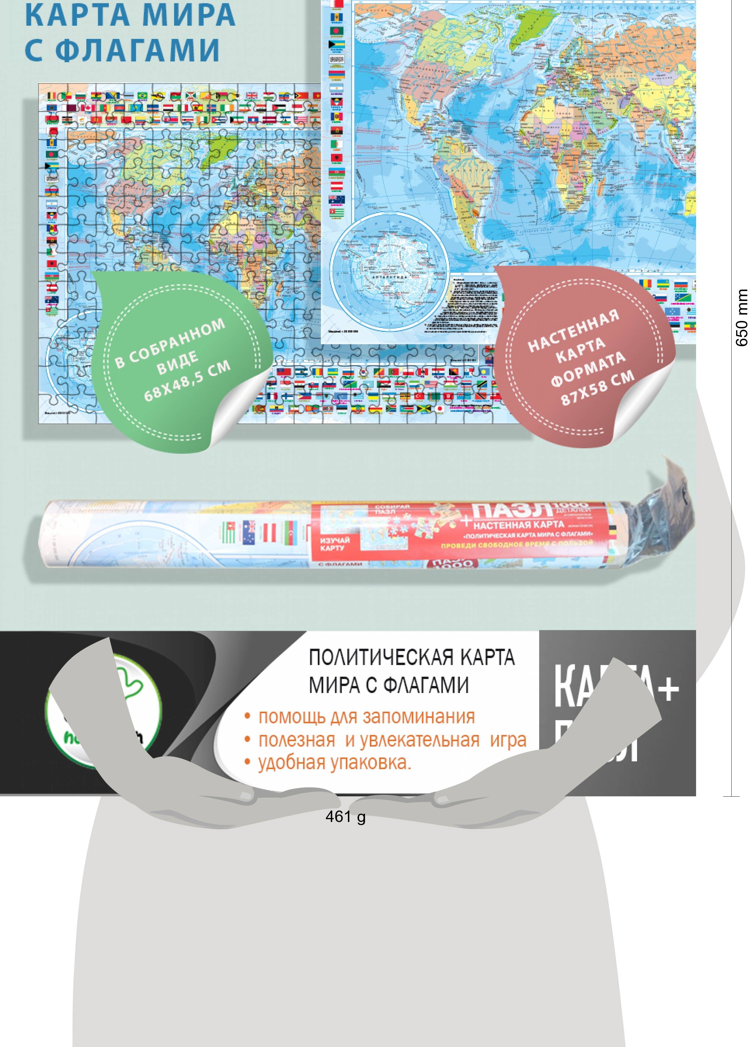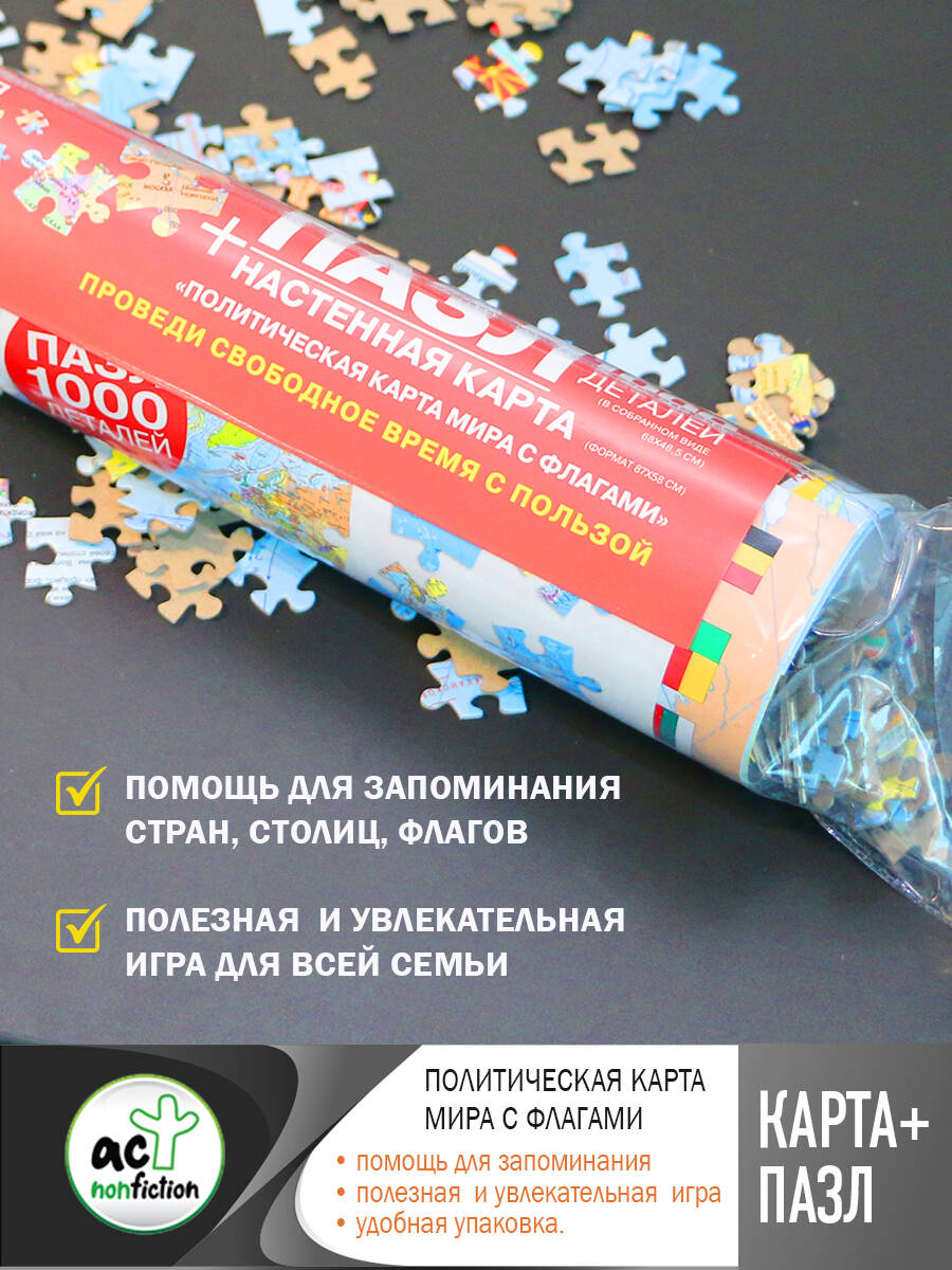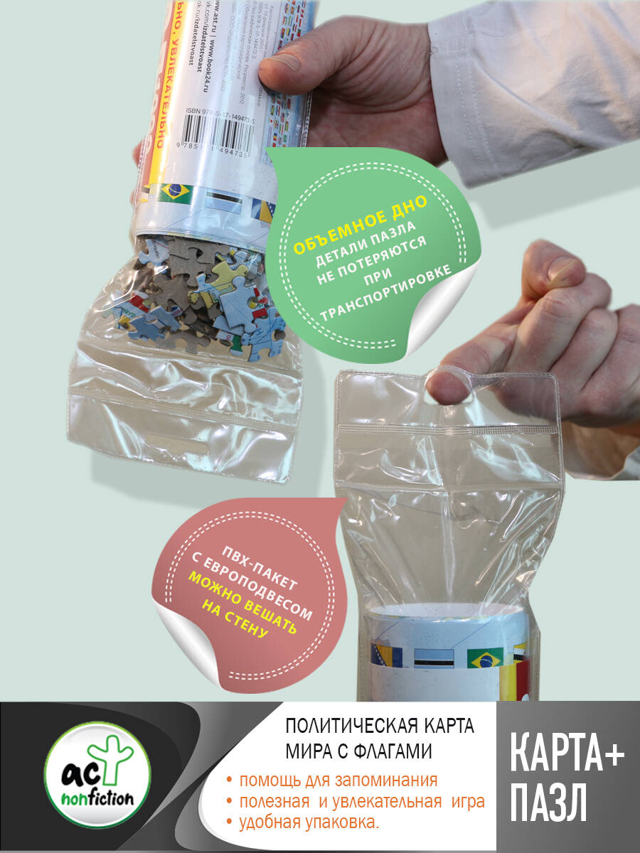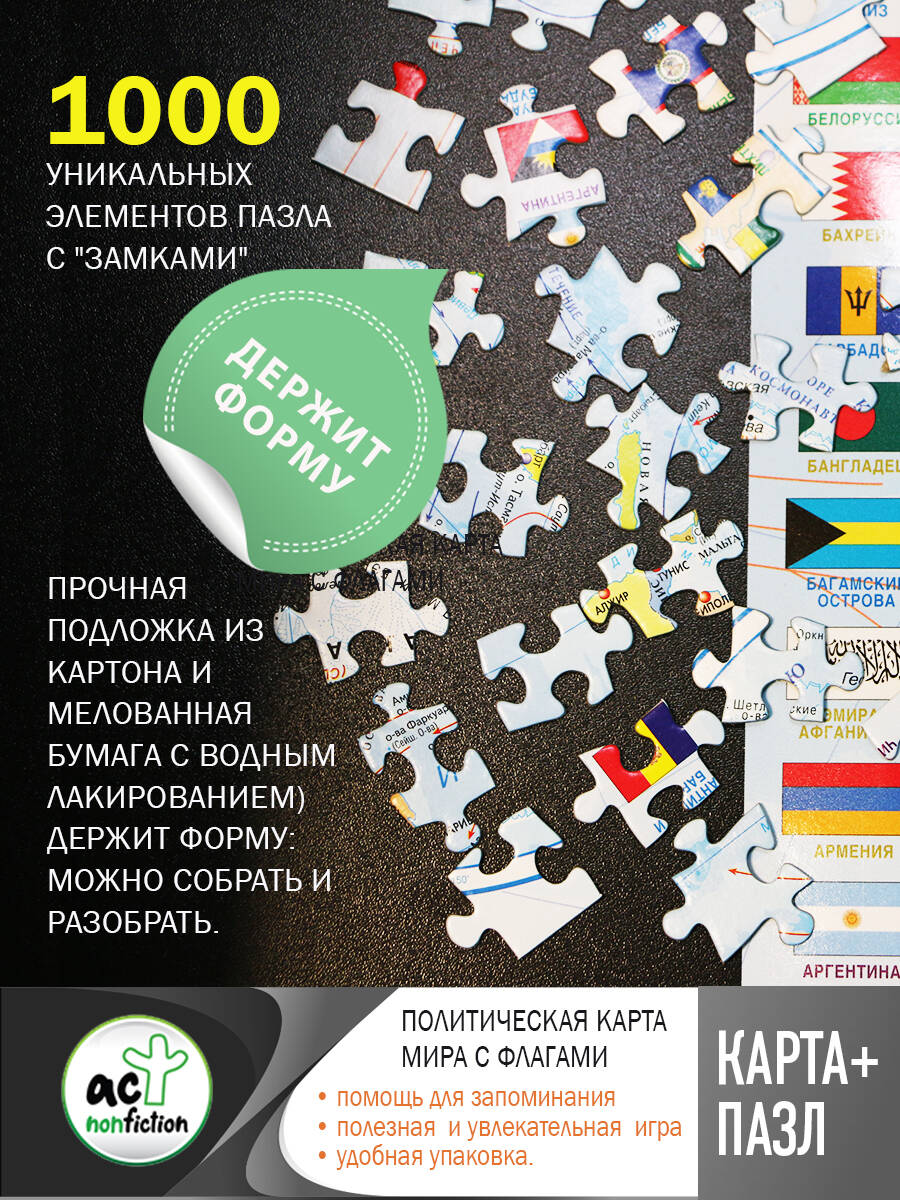 Комплект: Пазл 1000 деталей (в собранном виде 68х48,5 см) + настенная карта формата 87х58 см: • помощь для запоминания стран, их столиц и флагов; • полезная и увлекательная игра для всей семьи; • удобная упаковка. Настенная карта - декоративный образовательный объект на вашей стене. ПАЗЛ - полезный и увлекательный досуг плюс обучение. Данный пазл будет незаменим для школьников, изучающих географию, а также для людей, готовых разнообразить свой досуг. Займитесь сбором полезной головоломки всей семьей! Упаковка в ПВХ-пакет с европодвесом и объемным дном - детали пазла не потеряются при транспортировке. ГЕОГРАФИЧЕСКИЕ ЗНАНИЯ СОВРЕМЕННО, ПОЗНАВАТЕЛЬНО, УВЛЕКАТЕЛЬНО!| Издательство | ИЗДАТЕЛЬСТВО "АСТ" |