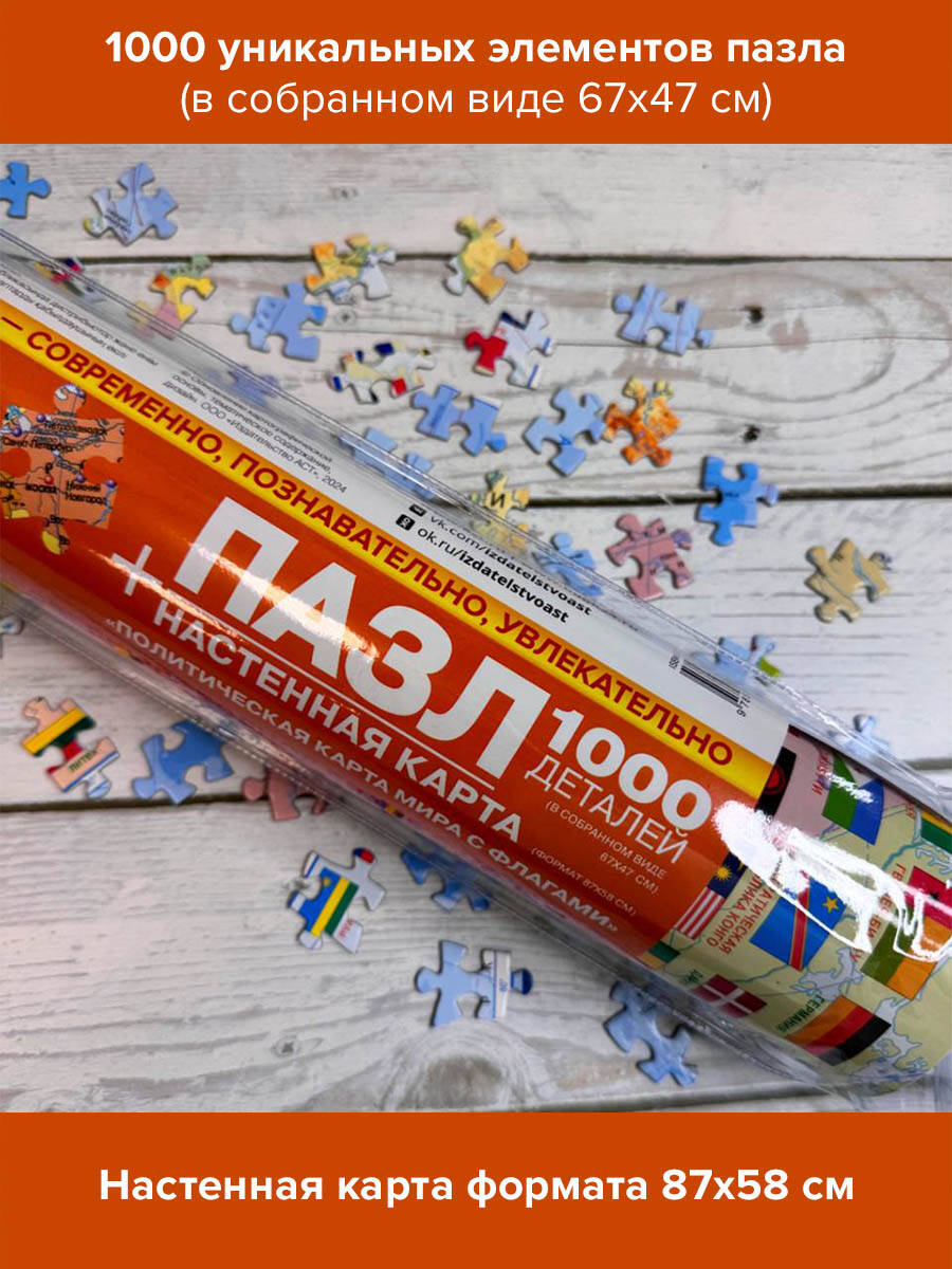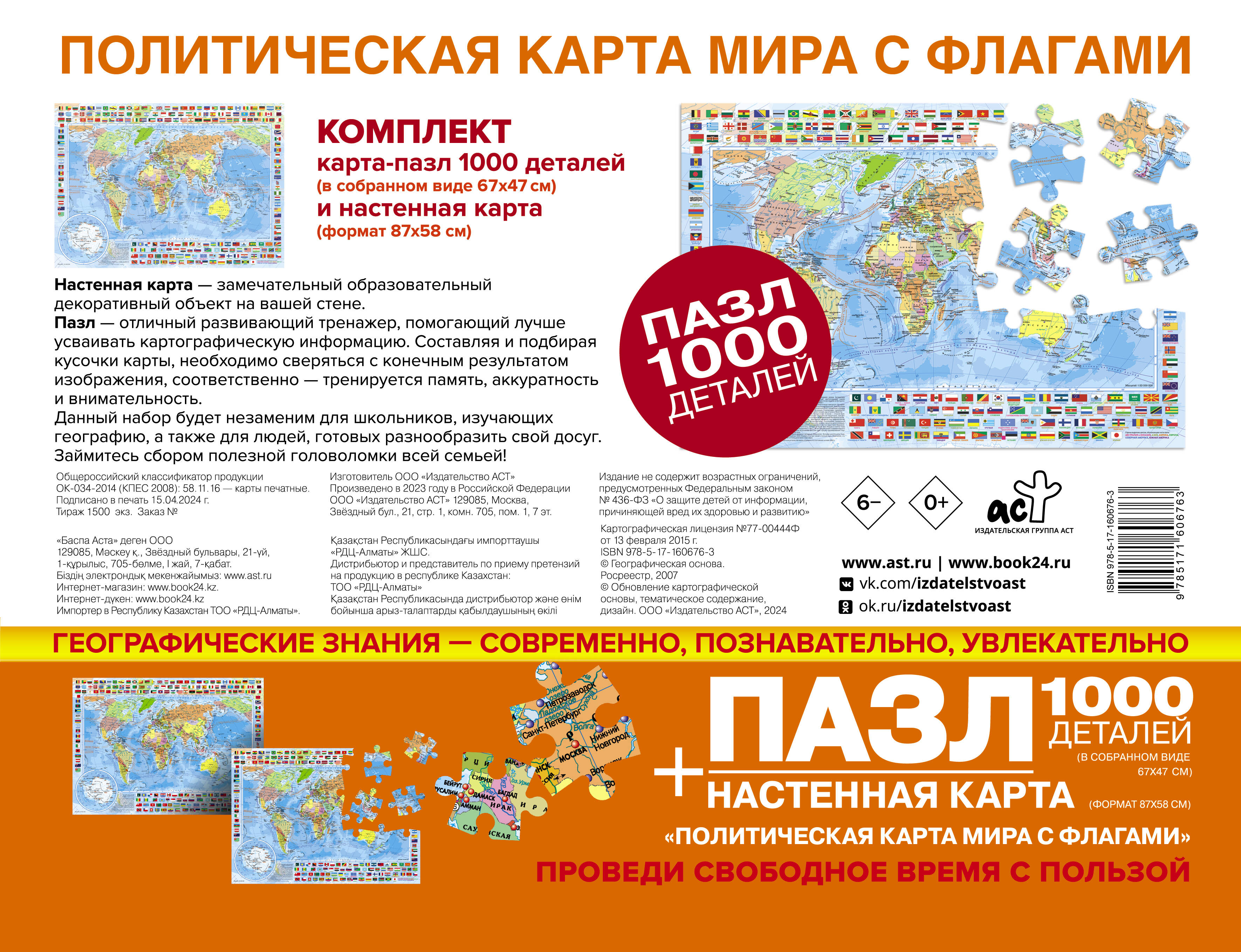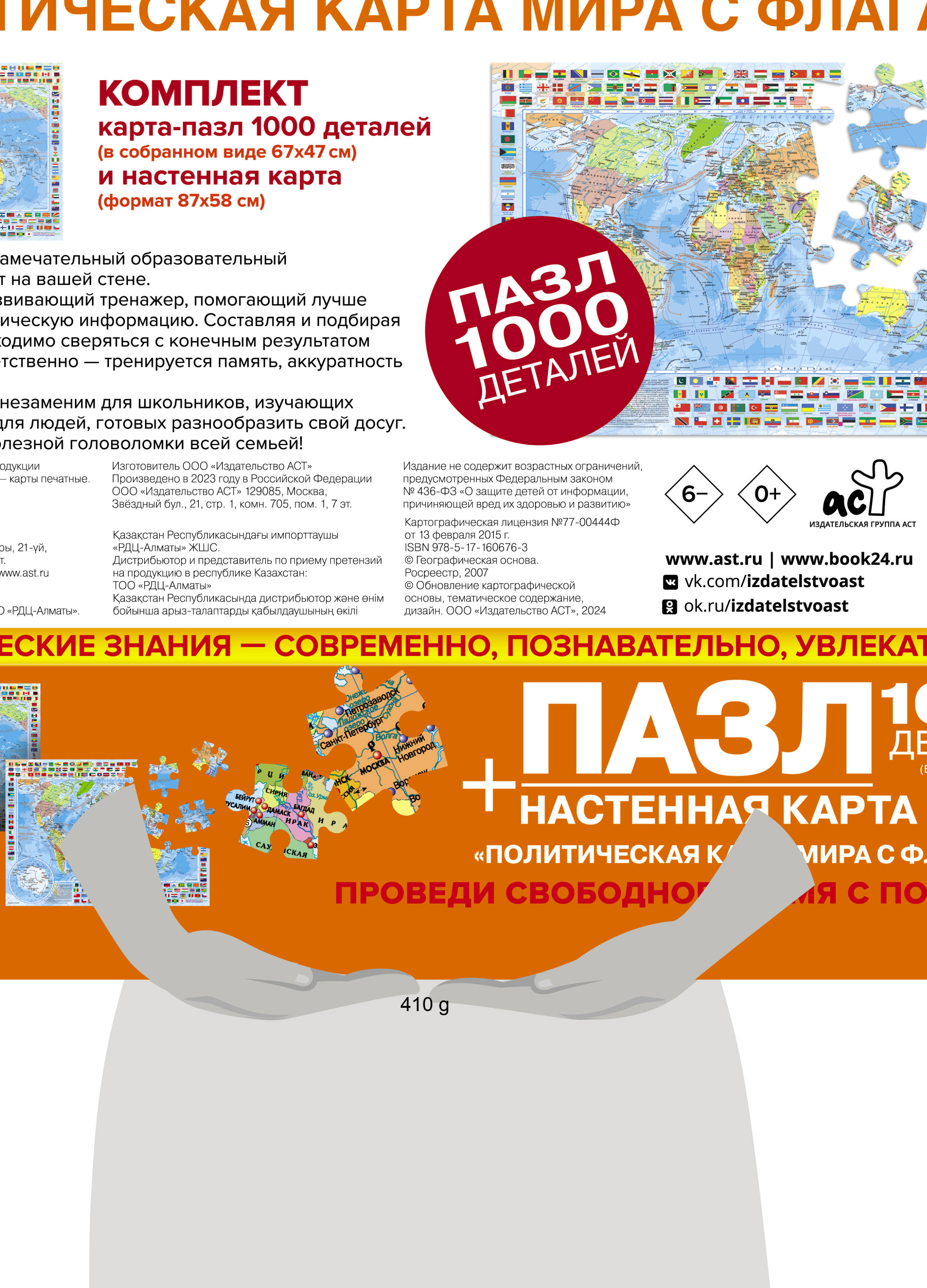 Комплект: Пазл 1000 деталей (в собранном виде 67х47 см) + настенная карта формата 87х58 см: • помощь для запоминания стран, их столиц и флагов; • полезная и увлекательная игра для всей семьи; • удобная упаковка. Настенная карта - декоративный образовательный объект на вашей стене. ПАЗЛ - полезный и увлекательный досуг плюс обучение. Собирая пазл, лучше усваивается картографическая информация. Составляя и подбирая кусочки карты, необходимо сверяться с конечным результатом изображения, соответственно - тренируется память, аккуратность и внимательность. Данный пазл будет незаменим для школьников, изучающих географию, а также для людей, готовых разнообразить свой досуг. Займитесь сбором полезной головоломки всей семьей! Упаковка в ПВХ-пакет с европодвесом и объемным дном - детали пазла не потеряются при транспортировке. ГЕОГРАФИЧЕСКИЕ ЗНАНИЯ СОВРЕМЕННО, ПОЗНАВАТЕЛЬНО, УВЛЕКАТЕЛЬНО!| Издательство | Издательство "АСТ" |