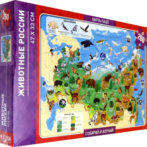Карта-пазл «Животные России» позволяет в процессе интересной игры легко изучить и познать окружающий мир растений и животных нашей родины! Ваш ребенок в процессе игры с большим интересом изучит флору и фауну в различных частях России, а также обитателей океанов и морей.