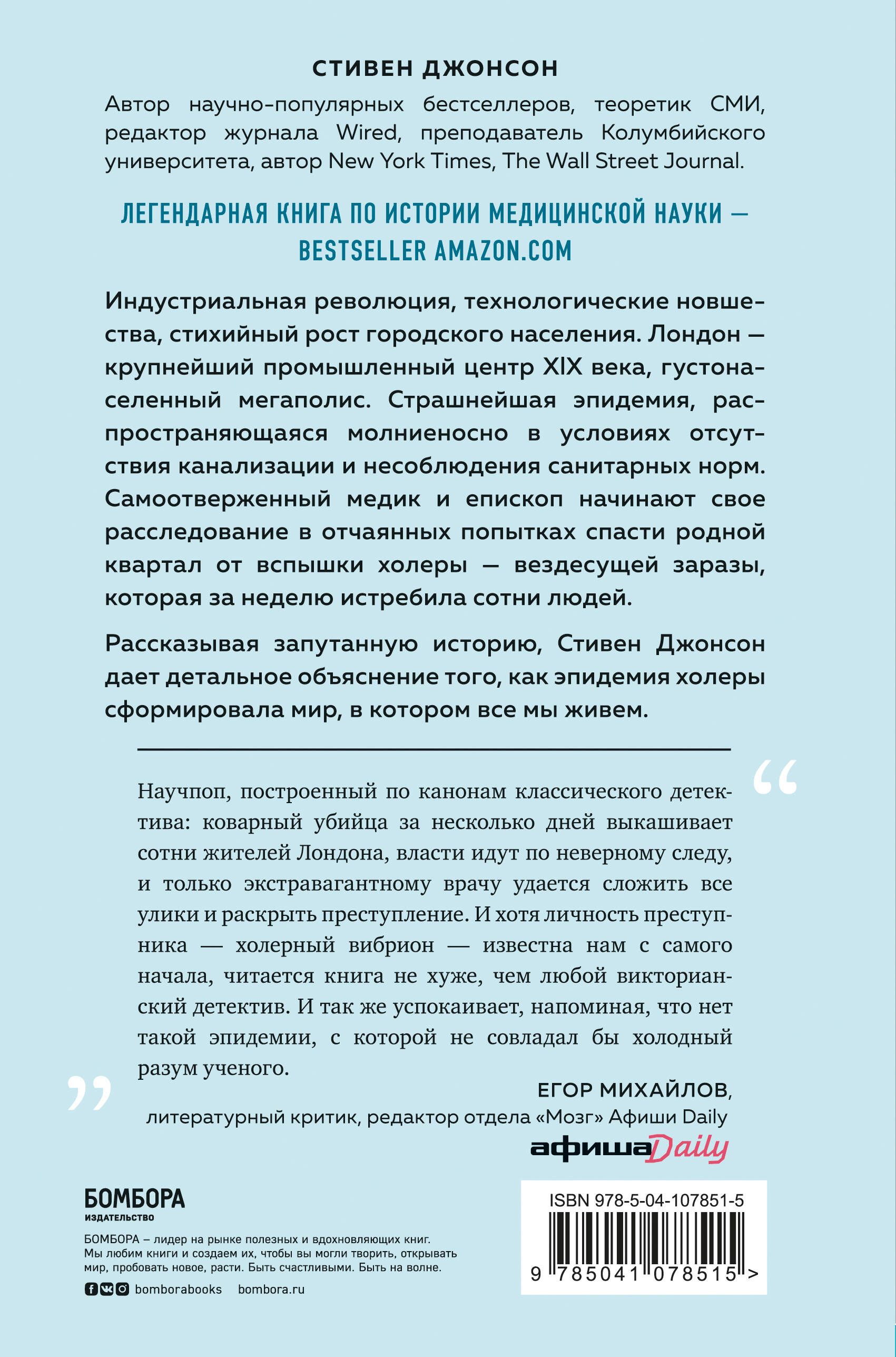 Стивен Джонсон освещает запутанные истории распространения болезней, возникновения городов и ход научных исследований, увлекая читателя в пугающее и захватывающее путешествие по Лондону конца XIX века - одному из самых развитых и передовых городов мира того времени. Рассказывая удивительную историю, он также дает мощное объяснение того, как эпидемия холеры сформировала мир, в котором все мы живем.| Издательство | ООО "Издательство "Эксмо" |