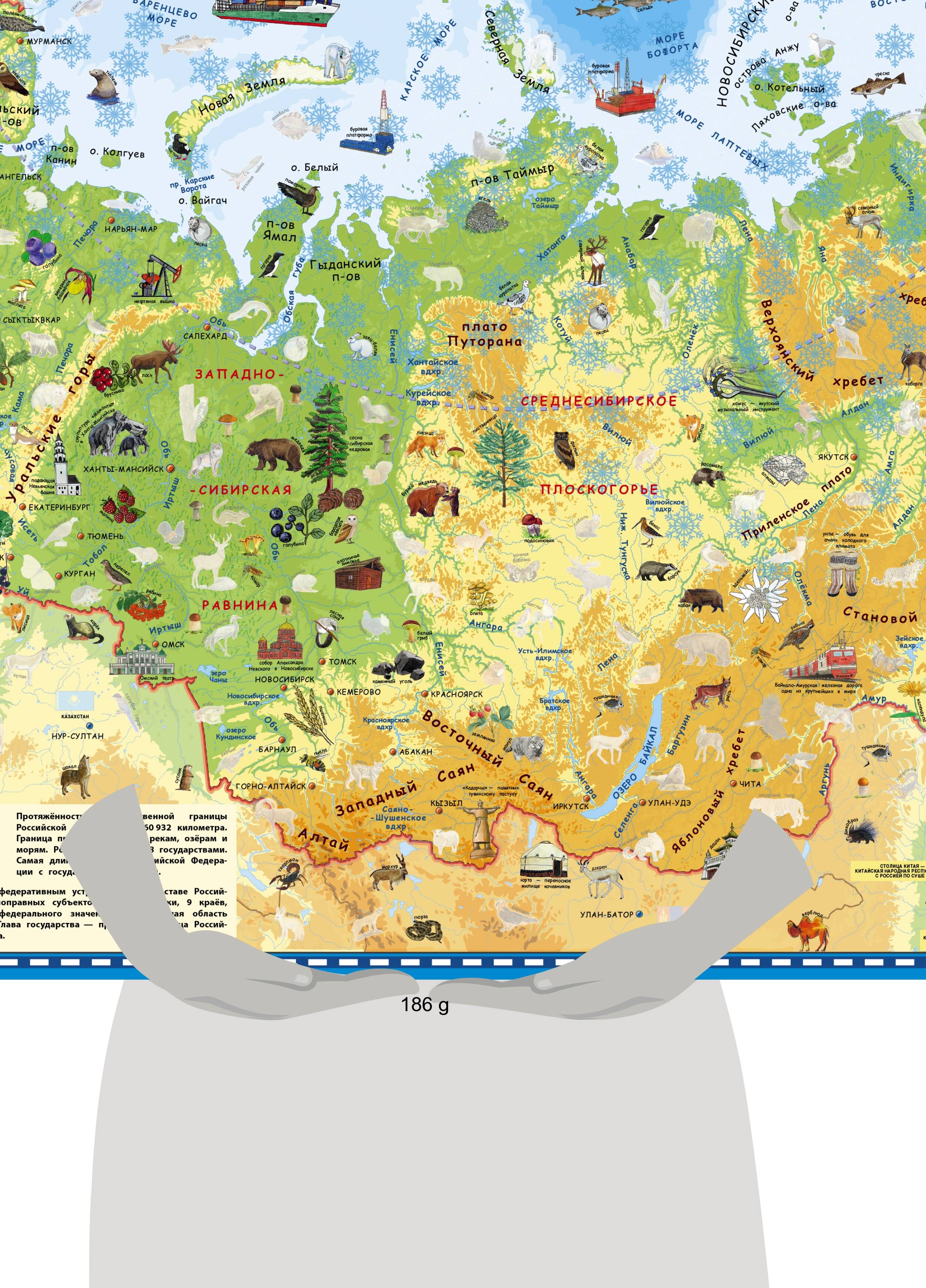 Путешествуй по России. Познакомься с уникальным животным миром страны. Запоминай названия морей, высоких гор и протяженных рек. Узнавай флаги стран - соседей России. Размер карты 108х79 см. Такой формат позволяет увидеть всю территорию страны, запомнить ее очертания. В комплекте с картой прилагается лист с наклейками. Для каждого изображения на карте отмечено место для наклеивания. Картой удобно пользоваться - ее можно разложить на полу или повесить на стену. При аккуратном наклеивании изображений на карту, она станет украшением интерьера детской. Надписи на карте даны крупным шрифтом. Рекомендуем детям от 4 лет. Игровые занятия с нашей картой расширяют кругозор и словарный запас, тренируют память, внимание, наблюдательность, смекалку и творческие способности.| Издательство | АСТ |