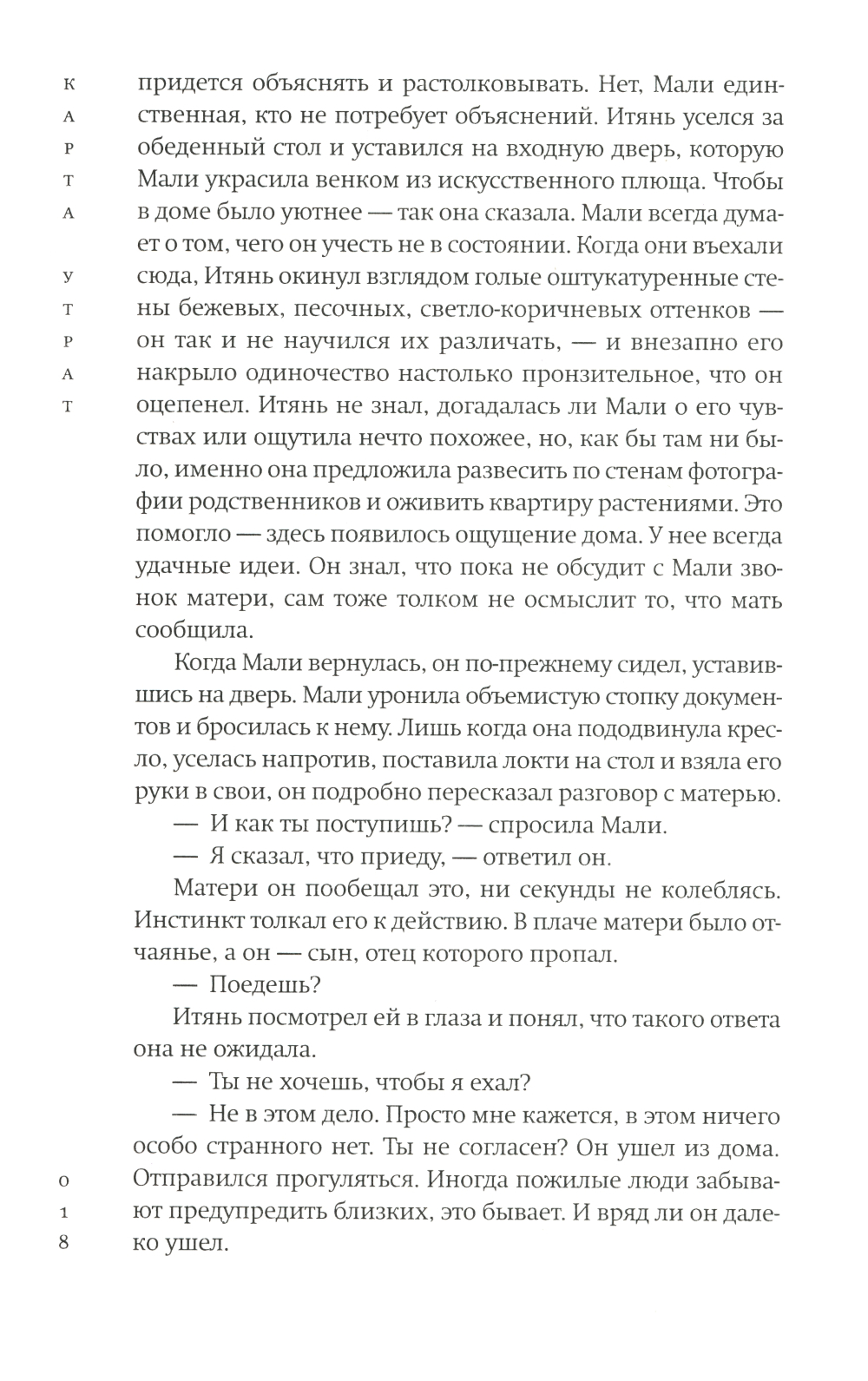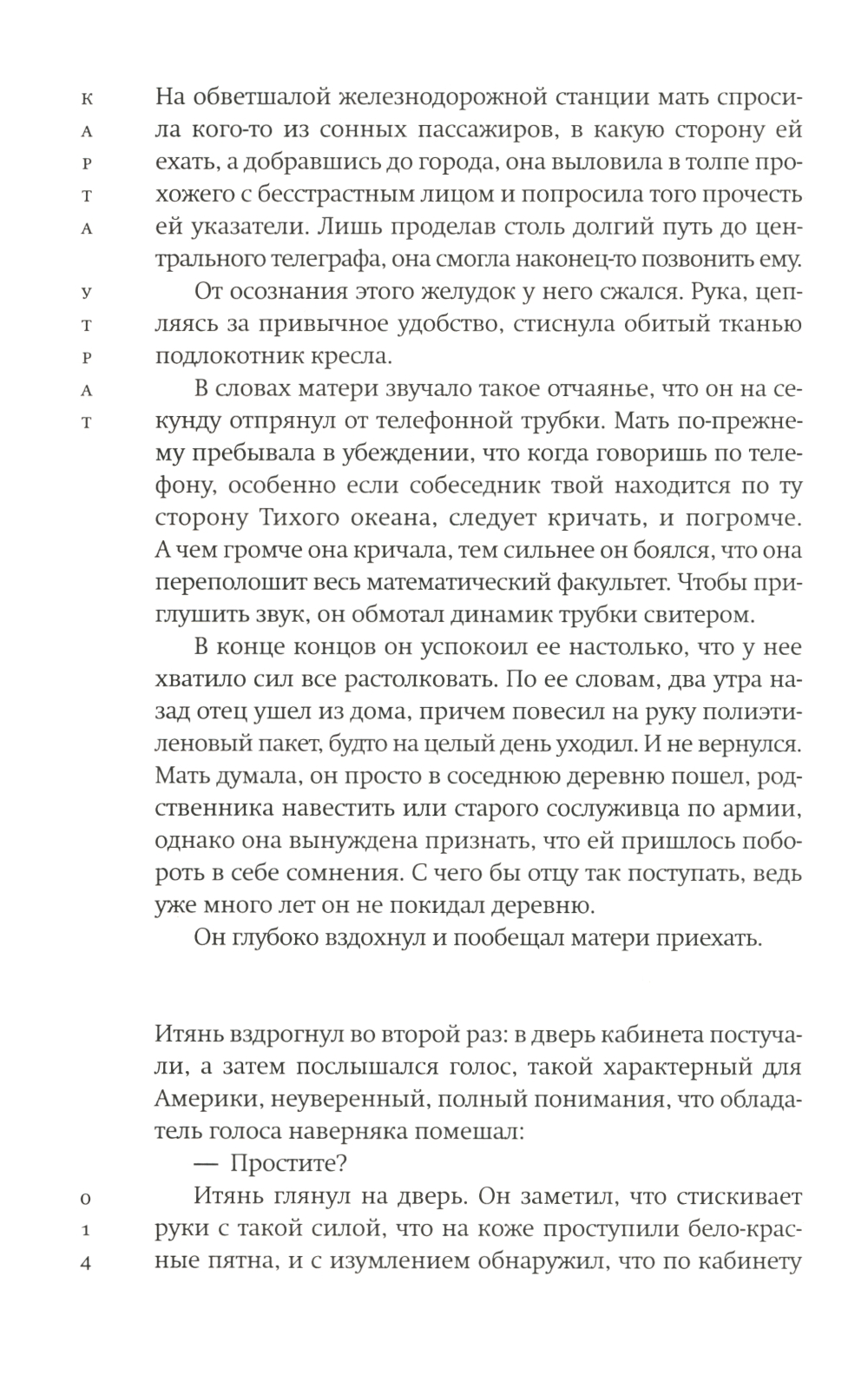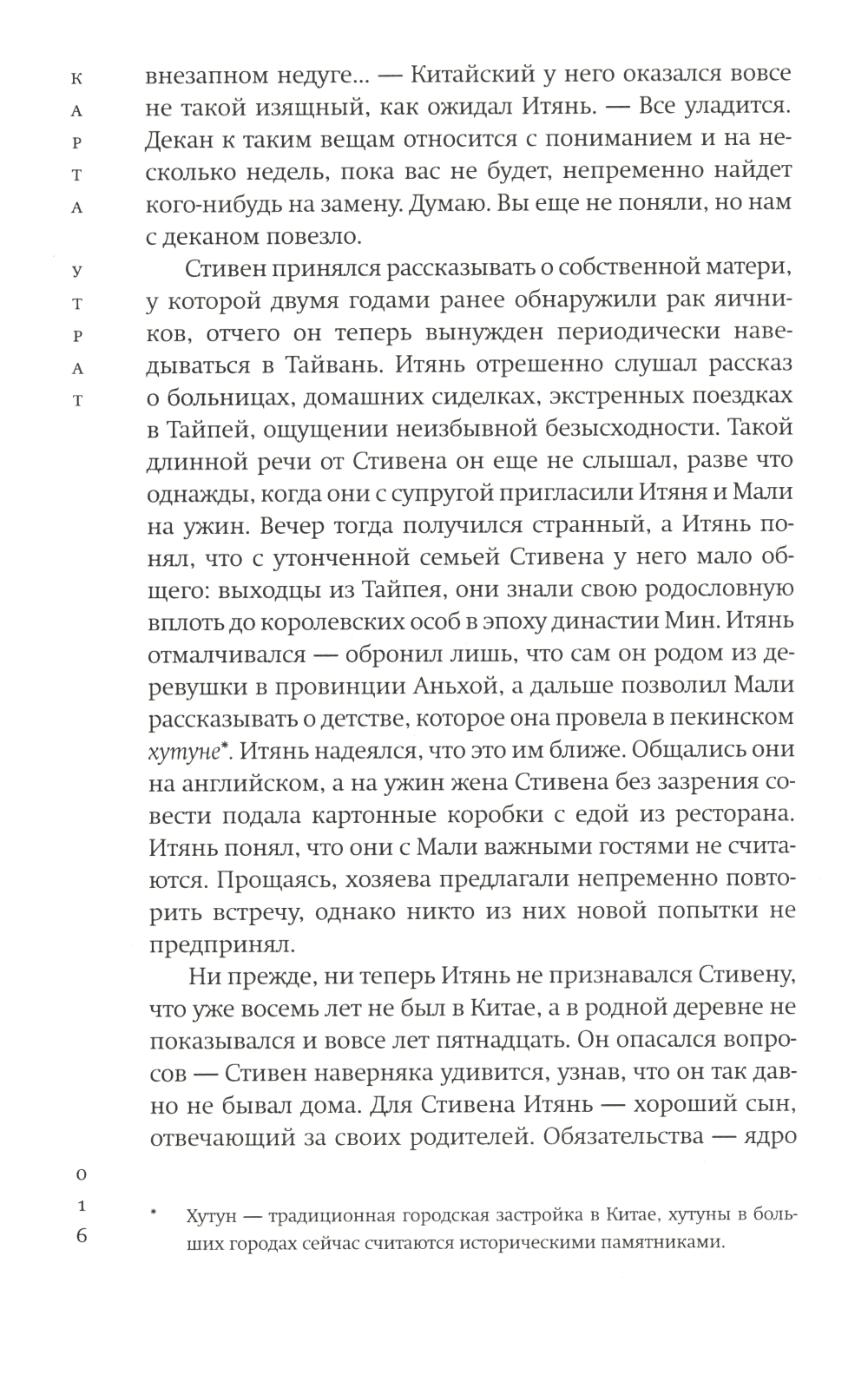 Эпический дебютный роман, действие которого разворачивается на фоне меняющегося Китая после Культурной революции. Роман о мечтах и жизни, которые остаются позади. Итянь живет в Америке уже почти десять лет, когда мать сообщает ему по телефону, что его отец ушел из их деревенского дома и не вернулся. И хотя Итянь не видел отца все эти годы и расстались они, не простив друг другу то, что случилось много лет назад, он решает вернуться в Китай. Оказавшись в родных и уже таких чужих краях, Итянь пытается восстановить события прошлого и одновременно разобраться в непроницаемой для пришельца бюрократии Китая. Уклончивость, с какой ведет себя мать, лишь усугубляет ситуацию с поисками. Выход лишь один: обратиться за помощью к единственному человеку, который его когда-то понимал. Ханьвэнь - городская девушка, она родилась и выросла в Шанхае, мечтала поступить в институт и выучиться на инженера, но ее, как и всех выпускников городских школ, "распределили" в деревню, где бывшие школьники должны поднимать сельское хозяйство Китая. Там она встречает Итяня, так непохожего на остальных деревенских парней, тайком читающего книги и мечтающего получить образование, которое ему недоступно. Спустя годы Итянь преподает в американском университете, а Ханьвэнь - светская дама, жена высокопоставленного китайского чиновника. Встретившись через много лет, они отправляются на поиски пропавшего старика, погружаясь в прошлое - свое и страны. "Карта утрат" - тонкий роман о семье, прощении, о попытках изменить судьбу и о том, что такое истинный дом.| Издательство | Фантом Пресс |
