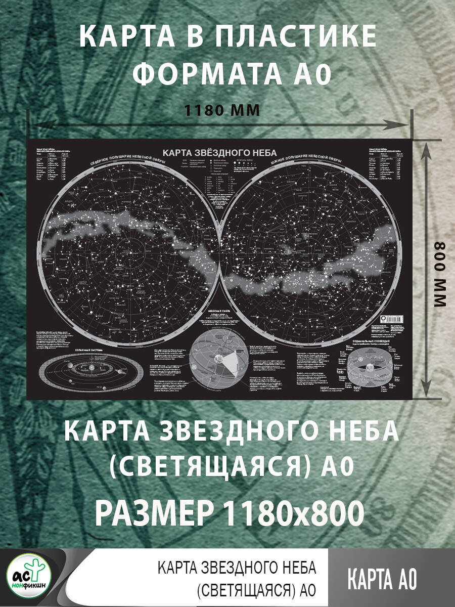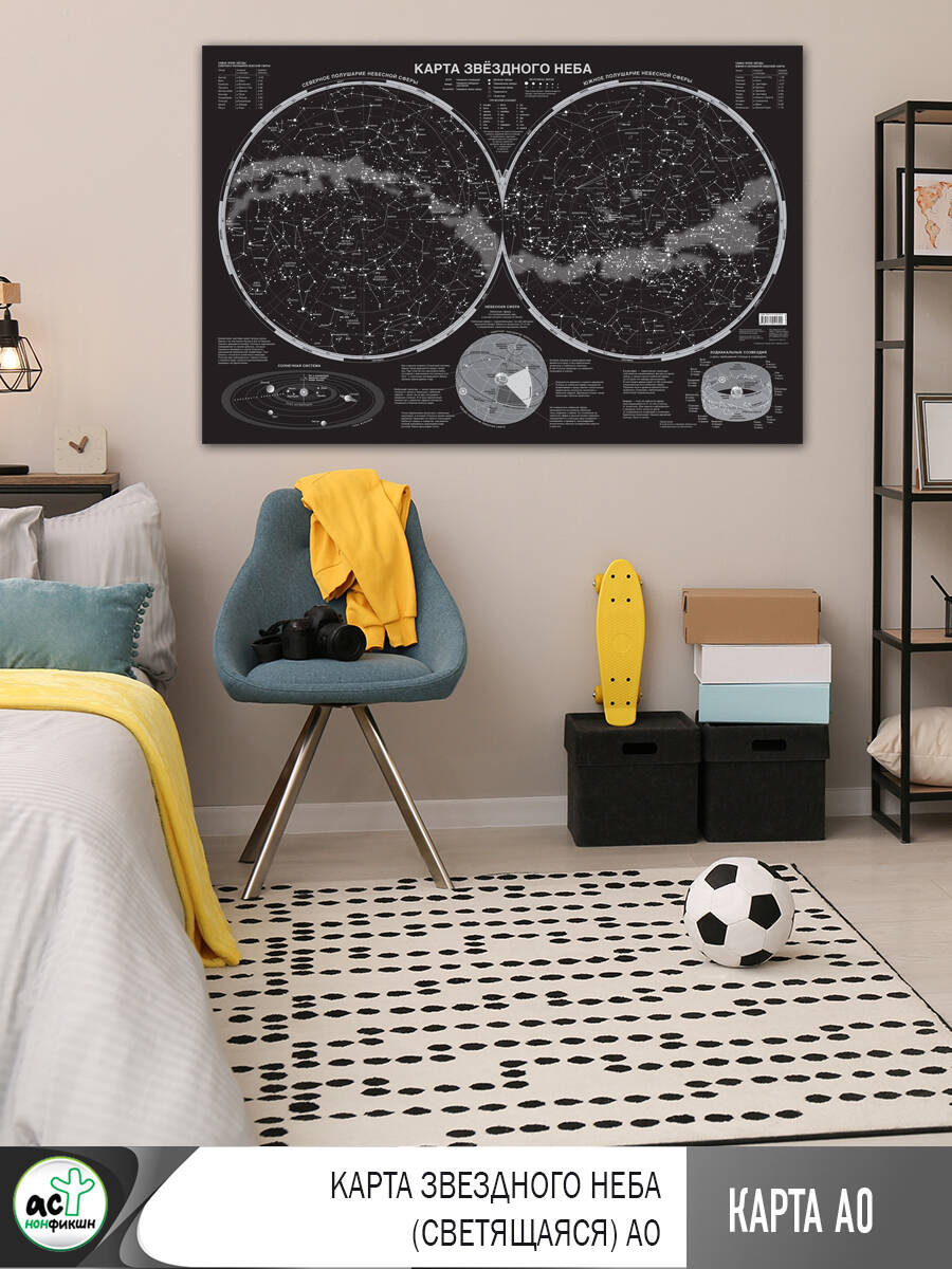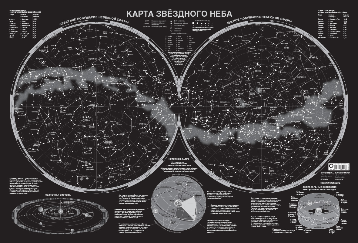 Карта звёздного неба - прекрасный подарок всем любителям астрономии. На ней показаны северное и южное полушария небесной сферы с наиболее яркими звёздными скоплениями, туманностями и галактиками, видимыми с Земли. Самые яркие звёзды на карте светятся в темноте, позволяя воображению сформировать контуры известных созвездий и создавая иллюзию звёздного неба. Карта дополнена краткими сведениями о Солнечной системе, небесной сфере, звёздных координатах, эклиптике и зодиакальном круге.| Издательство | АСТ |