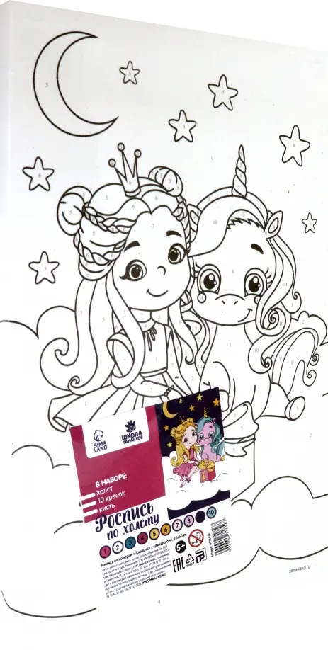 В наборе: холст на подрамнике с пронумерованными контурами, краски акриловые в баночках (10 цветов), кисть, инструкция.