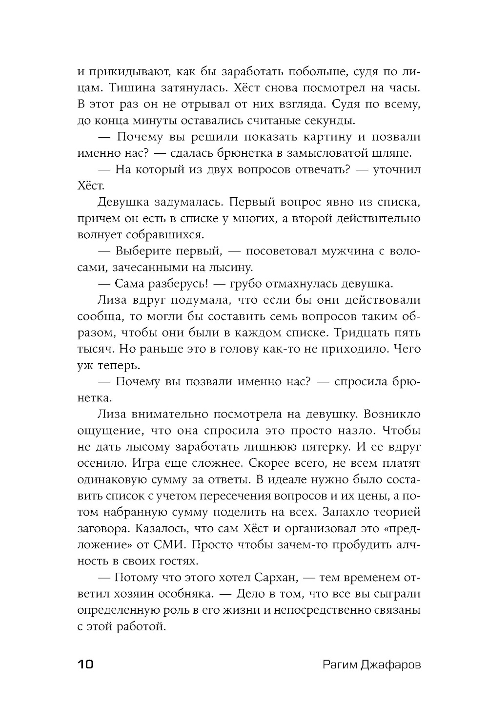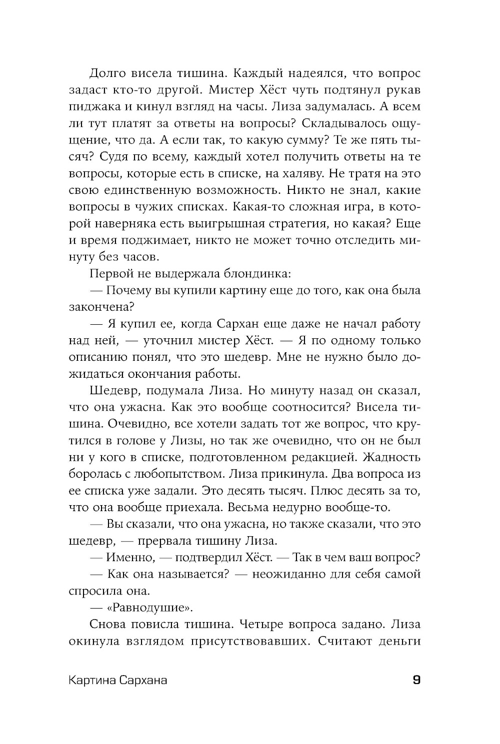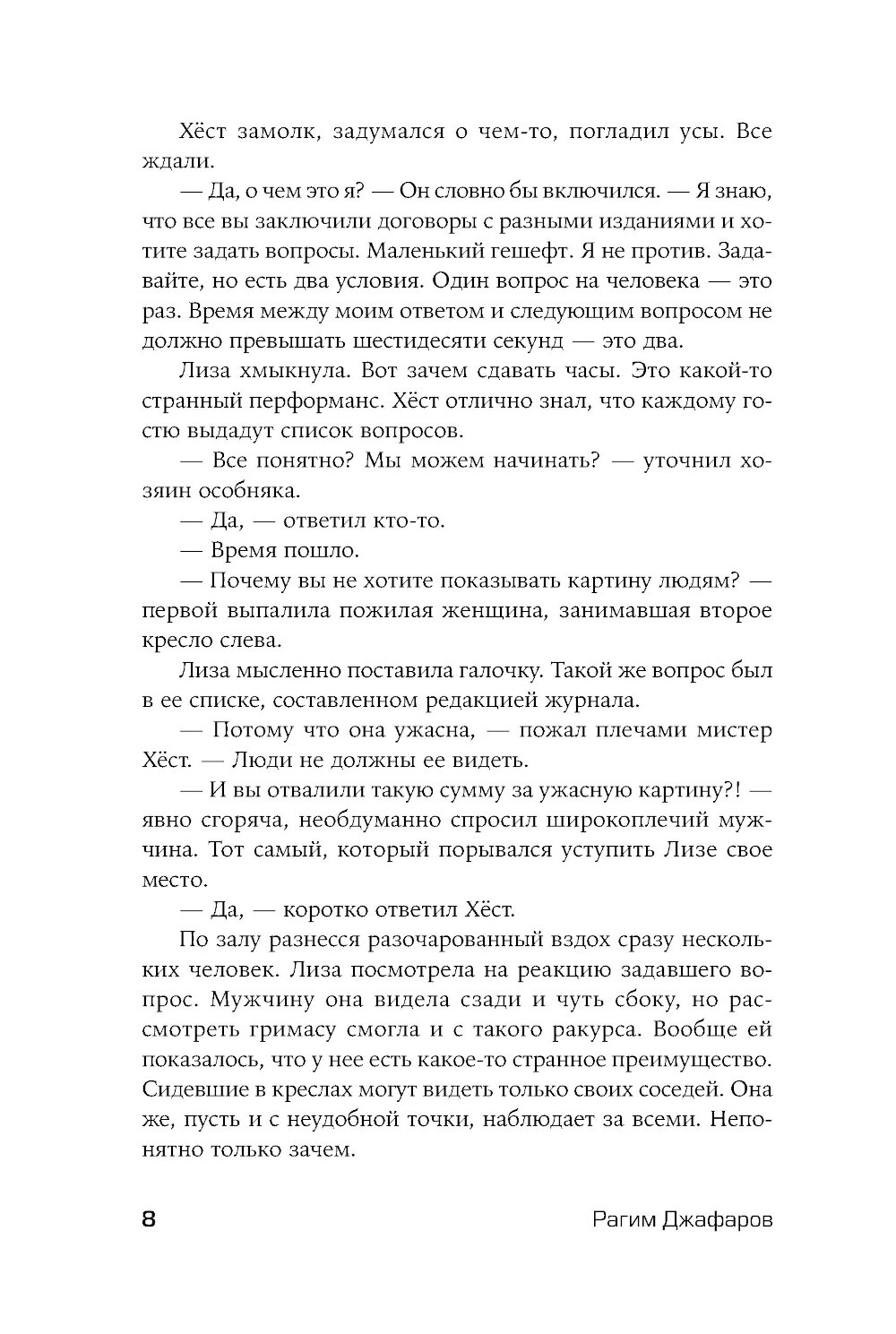 На закрытую презентацию картины, купленной за баснословные деньги еще до ее написания, эксцентричный миллионер мистер Хёст приглашает семерых незнакомых ни с ним, ни между собой людей. Главной героине романа Лизе предстоит разобраться в том, почему она оказалась там, и столкнуться с ошеломительными последствиями этого события. Роман лауреата премий «Нос» и «Новые горизонты» Рагима Джафарова ставит вопросы интерпретации искусства, границ нормы, психологического кризиса и поисков себя.| Издательство | Альпина нон-фикшн |