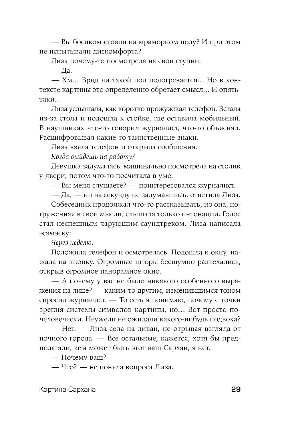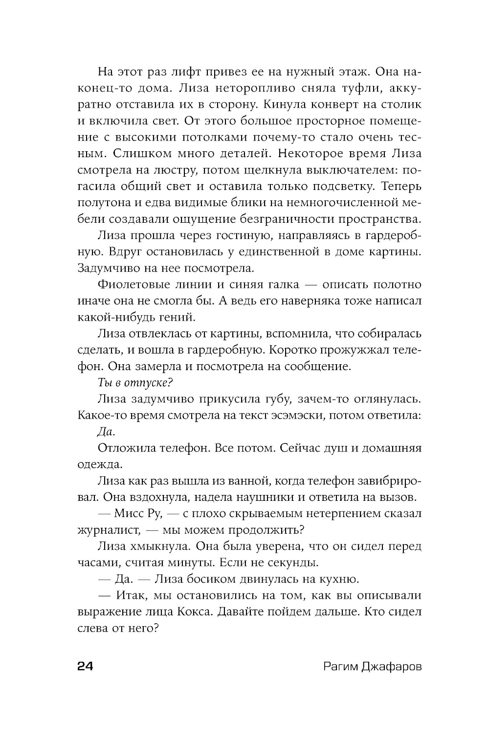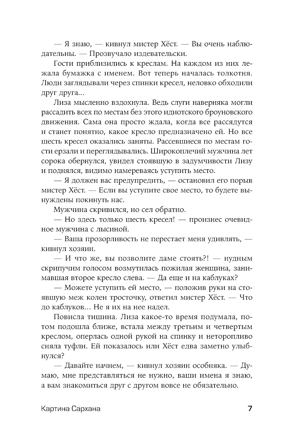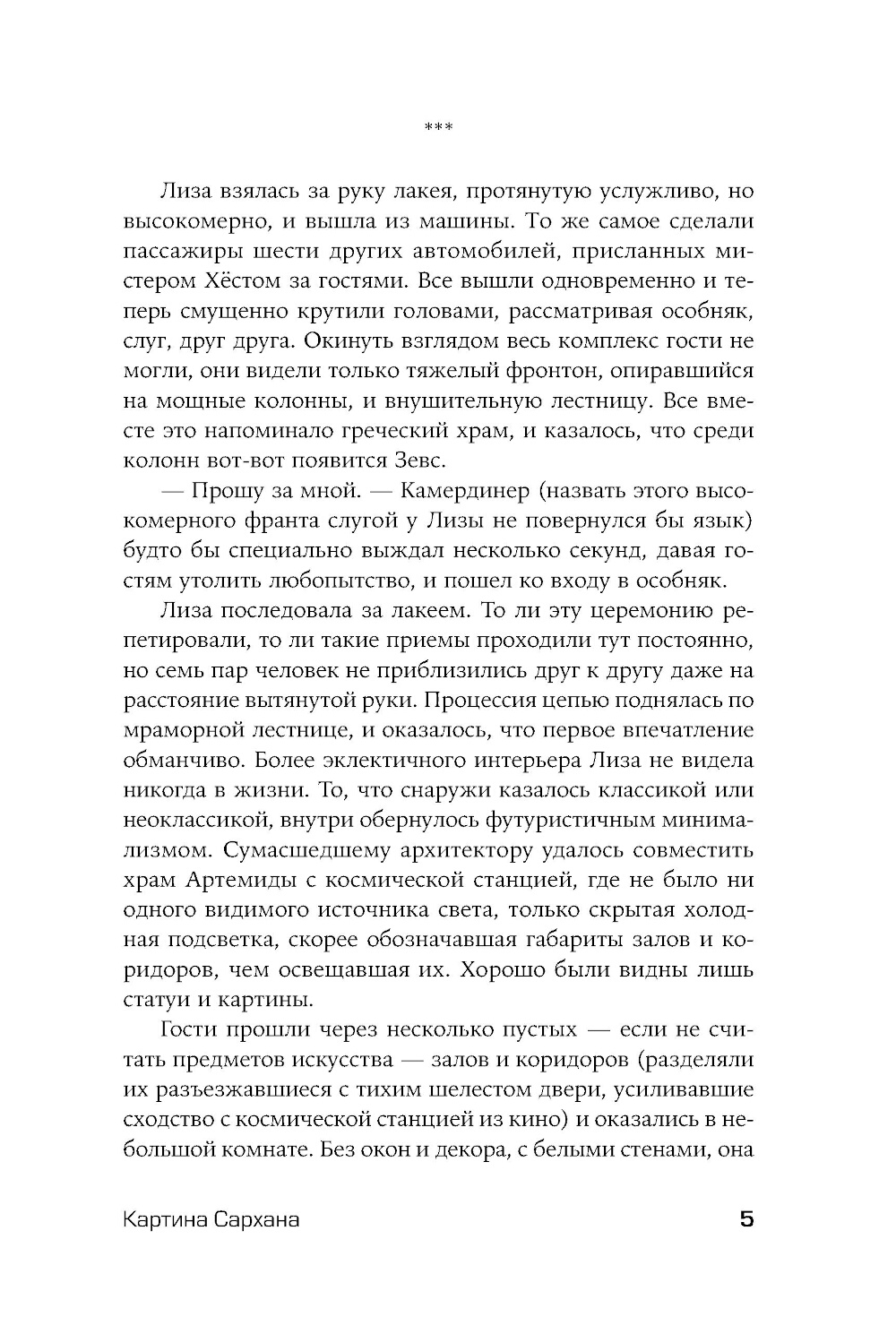 На закрытую презентацию картины, купленной за баснословные деньги еще до ее написания, эксцентричный миллионер мистер Хёст приглашает семерых незнакомых ни с ним, ни между собой людей. Главной героине романа Лизе предстоит разобраться в том, почему она оказалась там, и столкнуться с ошеломительными последствиями этого события. Роман лауреата премий «Нос» и «Новые горизонты» Рагима Джафарова ставит вопросы интерпретации искусства, границ нормы, психологического кризиса и поисков себя.| Издательство | Альпина нон-фикшн |