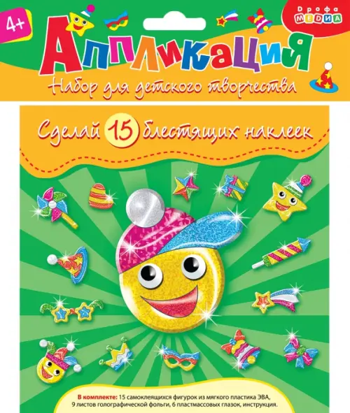 В комплекте: 15 мягких объёмных фигурок на самоклеящейся основе, 9 листов голографической фольги, пластмассовые глазки, инструкция.