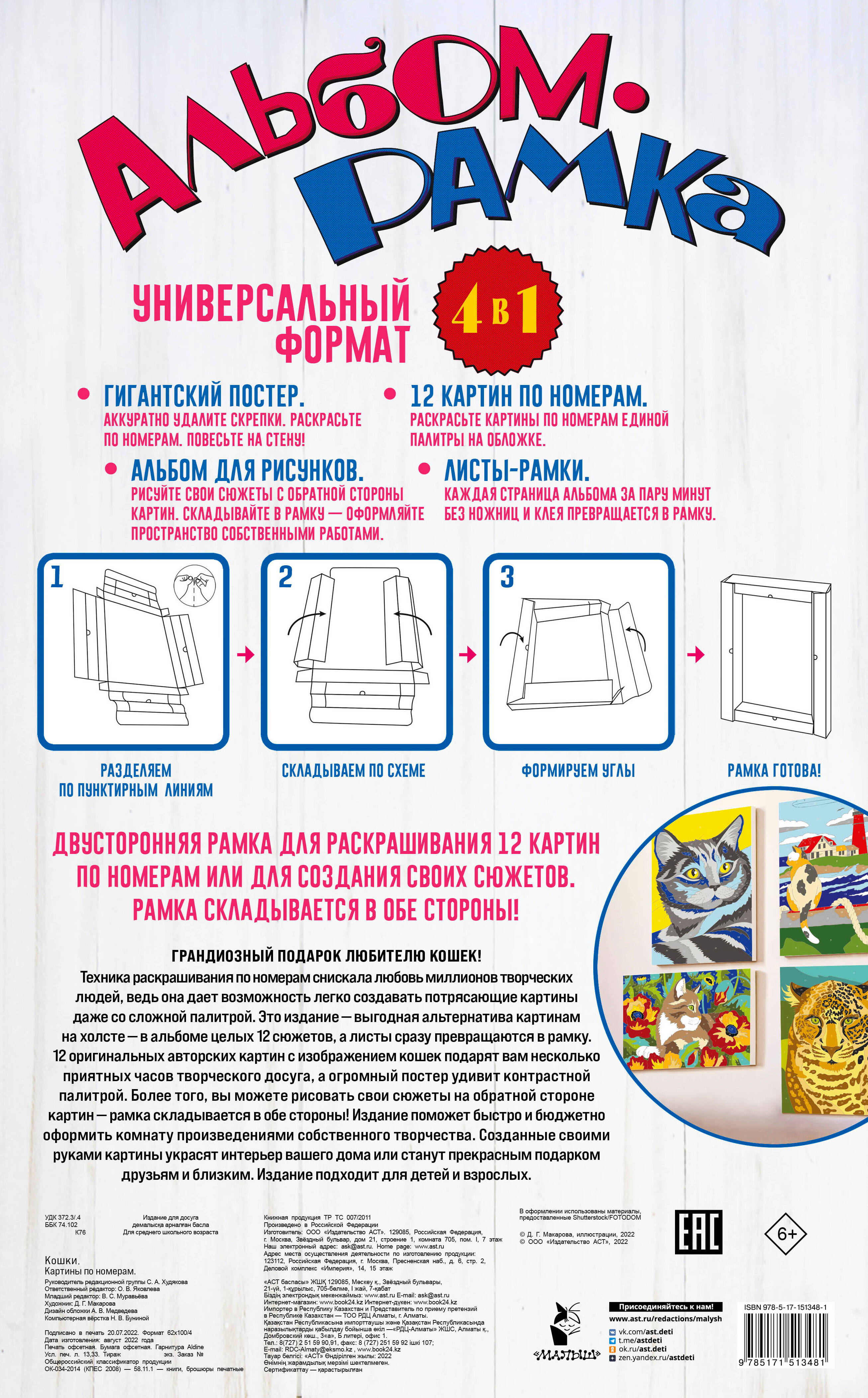 Гигантский альбом-рамка - формат альбома для быстрого оформления стен рисунками, не требующий дополнительных вложений. Рисунки сразу складываются в готовую рамку! В альбоме плотная бумага - можно рисовать фломастерами, гелиевыми ручками, карандашами. Универсальный формат для творчества. Без ножниц и клея твоя работа в 3 шага складывается в рамку, которую легко повесить на стену. Двухсторонняя рамка для 12 мотиваторов или 12 собственных рисунков. Выбирай! Рамка складывается в обе стороны! Рисуй с одной стороны или раскрашивай с другой. Гигантский постер-раскраска. Раскрась по номерам! 12 картин для раскрашивания посвященных нашим любимым и таким разным кошкам - милым и грозным, смешным и загадочным.| Издательство | ИЗДАТЕЛЬСТВО "АСТ" |