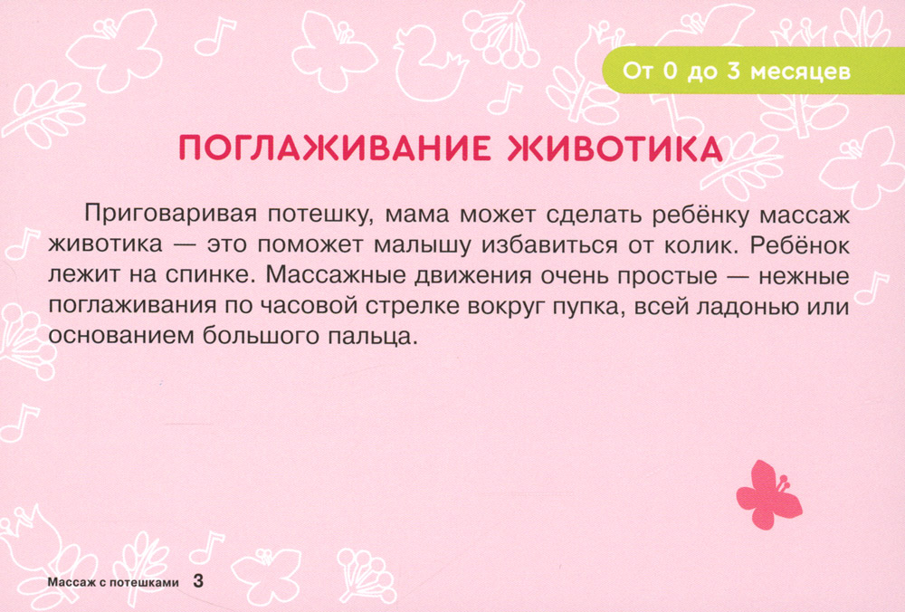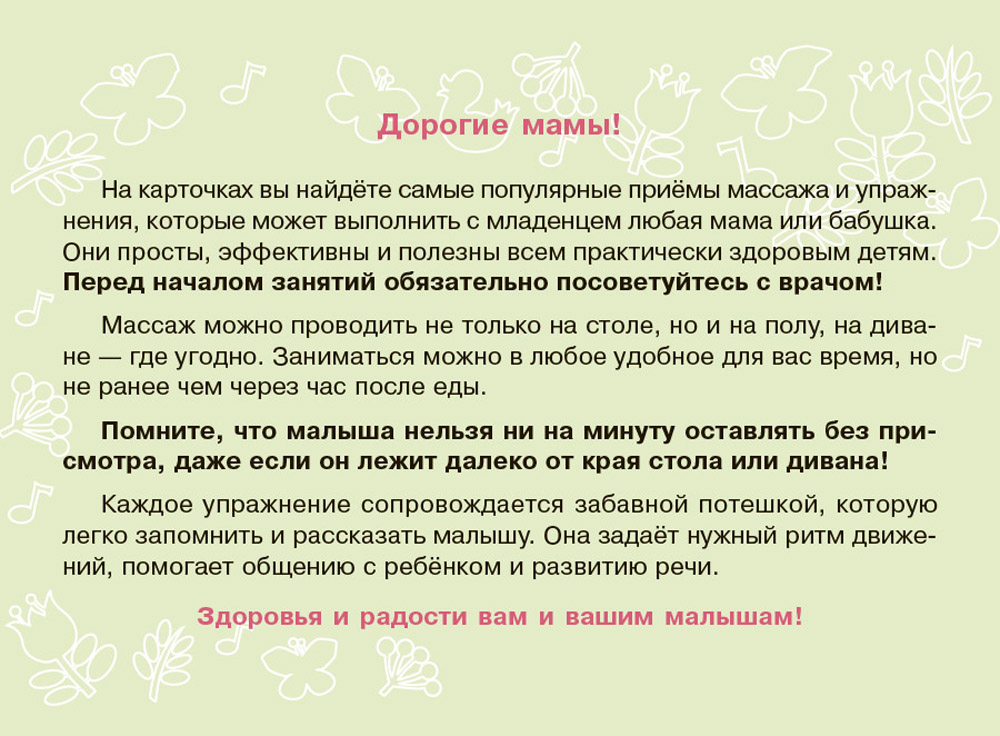 На карточках «Массаж с потешками для грудничка» вы найдете самые популярные приемы массажа и упражнения, которые может выполнить с младенцем любая мама или бабушка. Каждое упражнение сопровождается потешкой, которую легко запомнить и рассказать малышу. Потешка задает нужный ритм движениям мамы и помогает общению с малышом.| Издательство | ИД ЛИТЕРА |