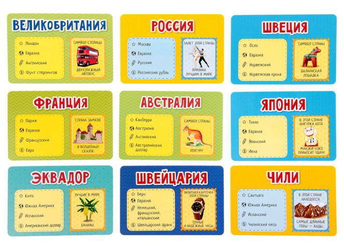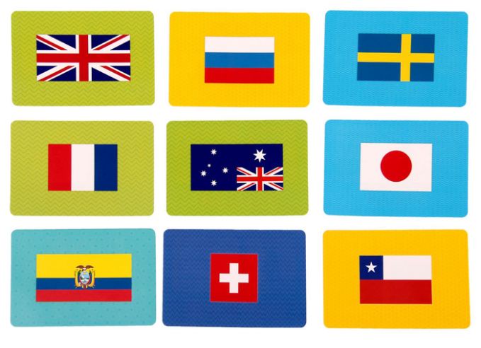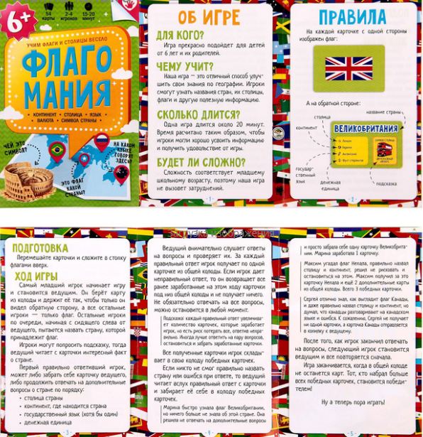 Внутри: 54 карточки с флагами, правила игры.
