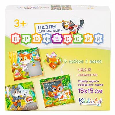 Картонный пазл 4в1 "Профессии" (31 дет.) Картонные пазлы для малышей от KiddieArt - это отличный способ изучить окружающий мир. Каждый из 4-х пазлов выполнен в виде картинки с уникальным дизайном того или иного персонажа (времени года, профессии, транспорт и прочее), объединенных единой темой. Размер каждого собранного пазла составляет 15x15 см. Познакомиться с важными профессиями в игровой форме помогут собранные пазлы с изображенными в той или иной специальности животные. Так лиса станет доктором, сорока поваром, сова учителем, а волк полицейским. Подходит для детей от 3-х лет. Содержит 31 деталь.| Издательство | ЮНИТОЙС МСК ООО |