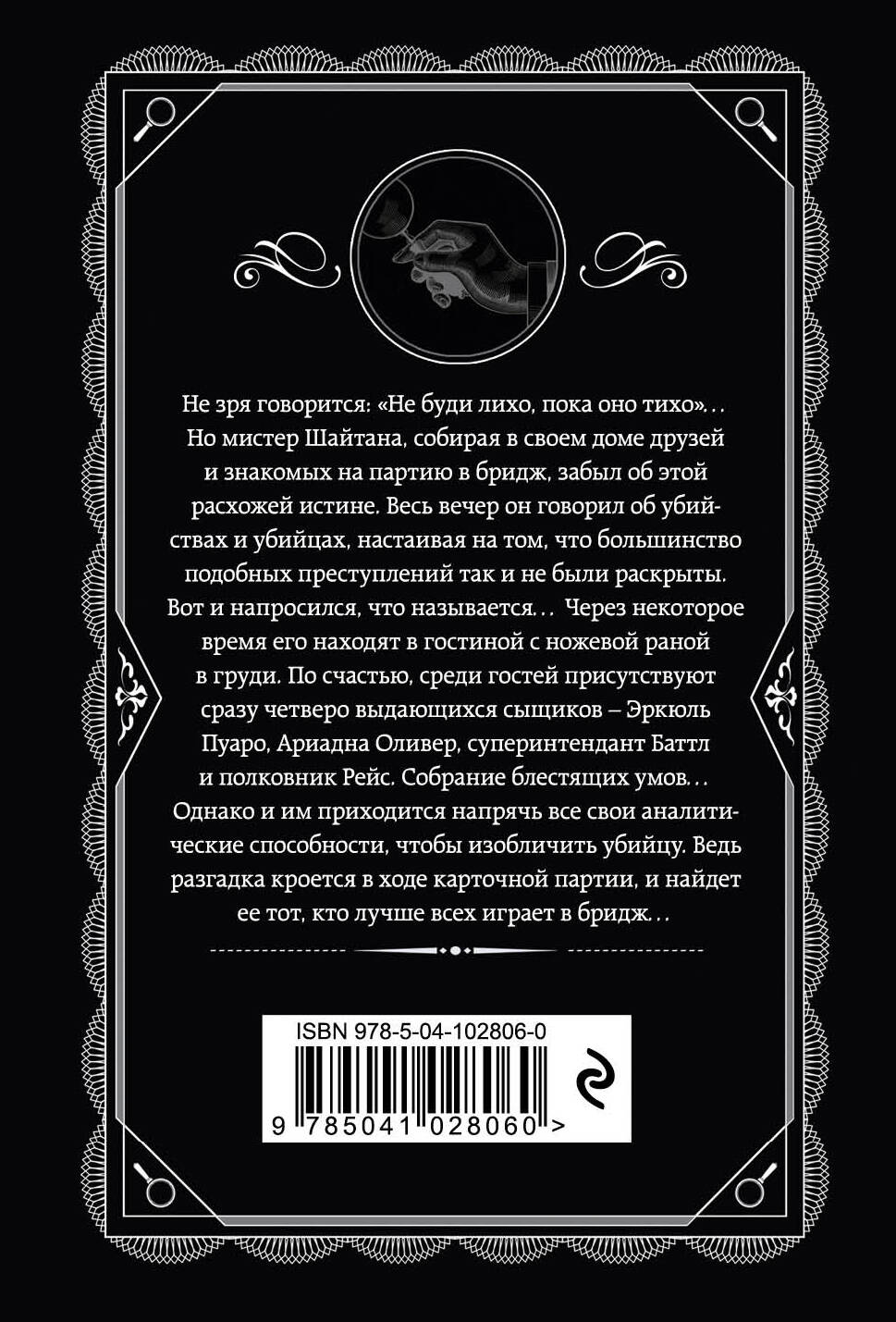 Не зря говорится: «Не буди лихо, пока оно тихо»… Но мистер Шайтана, собирая в своем доме друзей и знакомых на партию в бридж, забыл об этой расхожей истине. Весь вечер он говорил об убийствах и убийцах, настаивая на том, что большинство подобных преступлений так и не были раскрыты. Вот и напросился, что называется… Через некоторое время его находят в гостиной с ножевой раной в груди. По счастью, среди гостей присутствуют сразу четверо выдающихся сыщиков - Эркюль Пуаро, Ариадна Оливер, суперинтендант Баттл и полковник Рейс. Скопище блестящих умов… Однако и им приходится напрячь все свои аналитические способности, чтобы изобличить убийцу. Ведь разгадка кроется в ходе карточной партии, и найдет ее тот, кто лучше всех играет в бридж…| Издательство | ООО "Издательство "Эксмо" |