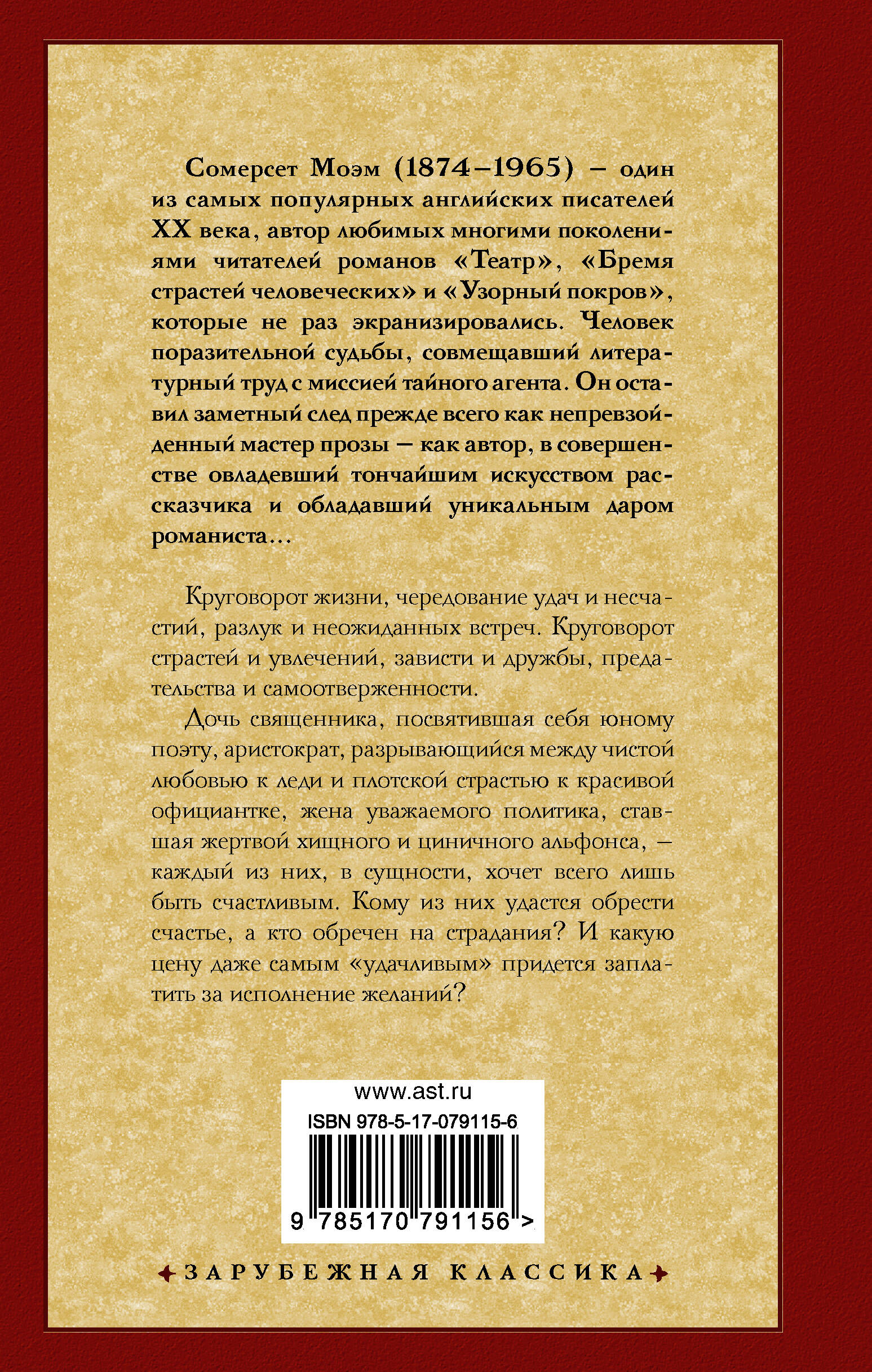 Круговорот жизни, чередование удач и несчастий, разлук и неожи-данных встреч. Круговорот страстей и увлечений, зависти и дружбы, пре-дательства и самоотверженности. Дочь священника, посвятившая себя юному поэту, аристократ, раз-рывающийся между чистой любовью к леди и плотской страстью к кра-сивой официантке, жена уважаемого политика, ставшая жертвой хищного и циничного альфонса, - каждый из них, в сущности, хочет всего лишь быть счастливым. Кому из них удастся обрести счастье, а кто обречен на страдания? И какую цену даже самым "удачливым" придется заплатить за исполнение желаний?| Издательство | ИЗДАТЕЛЬСТВО "АСТ" |