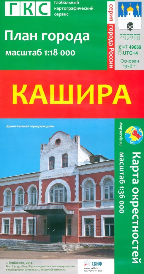 Кашира. План города + карта окрестностей Масштаб 1:18 000 (город), 1:136 000 Формат 70х100 см. 1 лист, складная карта.