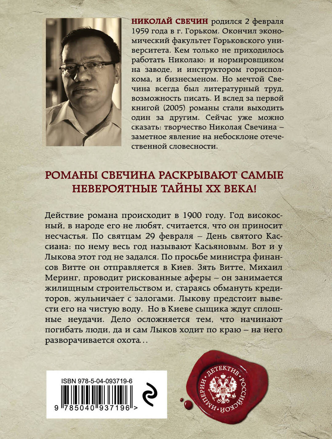 Действие романа происходит в 1900-м году. Год високосный, в народе его не любят, считается, что он приносит несчастья. По святцам 29 февраля - День святого Кассиана: по нему весь год называют Касьяновым. Вот и у Лыкова этот год не задался. По просьбе министра финансов Витте он отправляется в Киев. Зять Витте, Михаил Меринг, проводит рискованные аферы - он занимается жилищным строительством и, стараясь обмануть кредиторов, жульничает с залогами. Лыкову предстоит вывести его на чистую воду. Но в Киеве сыщика ждут сплошные неудачи. Дело осложняется тем, что начинают погибать люди, да и сам Лыков ходит по краю - на него разворачивается охота… Стильная серия модного автора ретро-детективов Николая Свечина! Журнал «Афиша» назвал Свечина надеждой русского детектива! Новый формат издания сделает чтение легким, интересным и доступным! Автор - аналог Акунина!| Издательство | ООО "Издательство "Эксмо" |