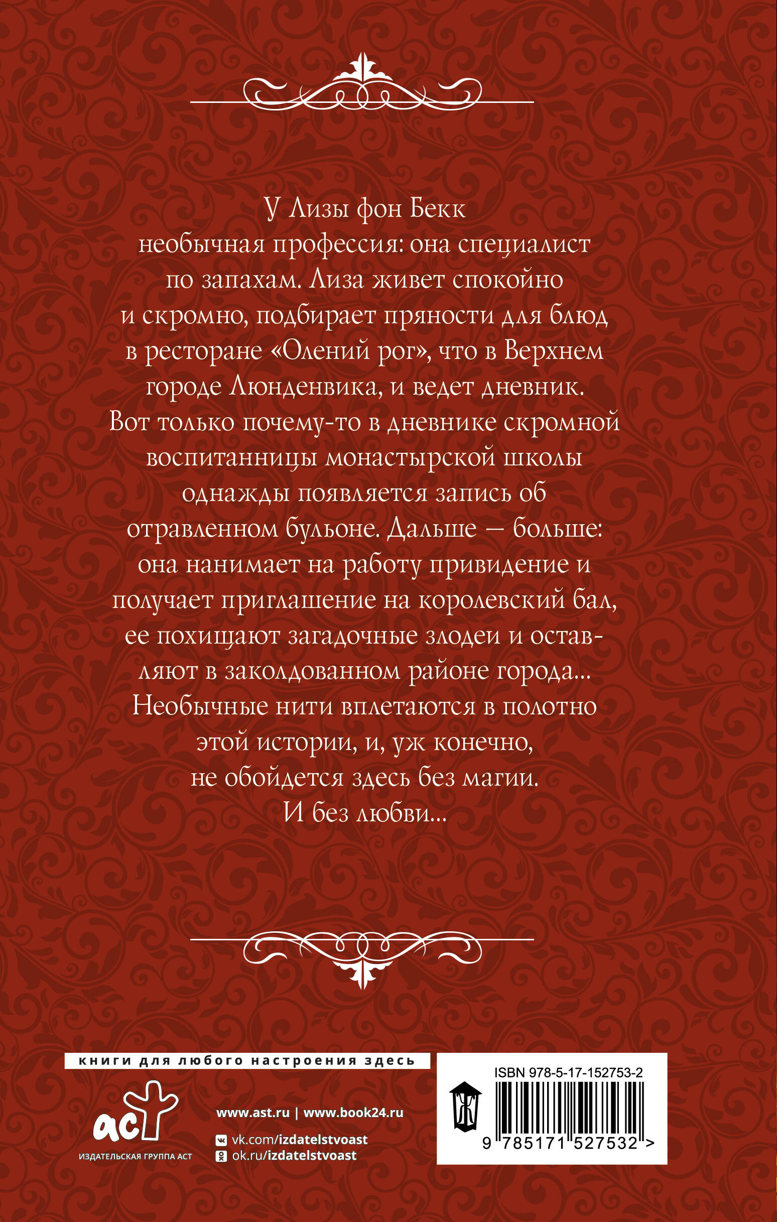 У Лизы фон Бекк необычная профессия: она специалист по запахам. Лиза живет спокойно и скромно, подбирает пряности для блюд в ресторане "Олений рог", что в Верхнем городе Люнденвика, и ведет дневник. Вот только почему-то в дневнике скромной воспитанницы монастырской школы однажды появляется запись об отравленном бульоне. Дальше - больше: она нанимает на работу привидение и получает приглашение на королевский бал, ее похищают загадочные злодеи и оставляют в заколдованном районе города… Необычные нити вплетаются в полотно этой истории, и, уж конечно, не обойдется здесь без магии. И без любви…| Издательство | ИЗДАТЕЛЬСТВО "АСТ" |