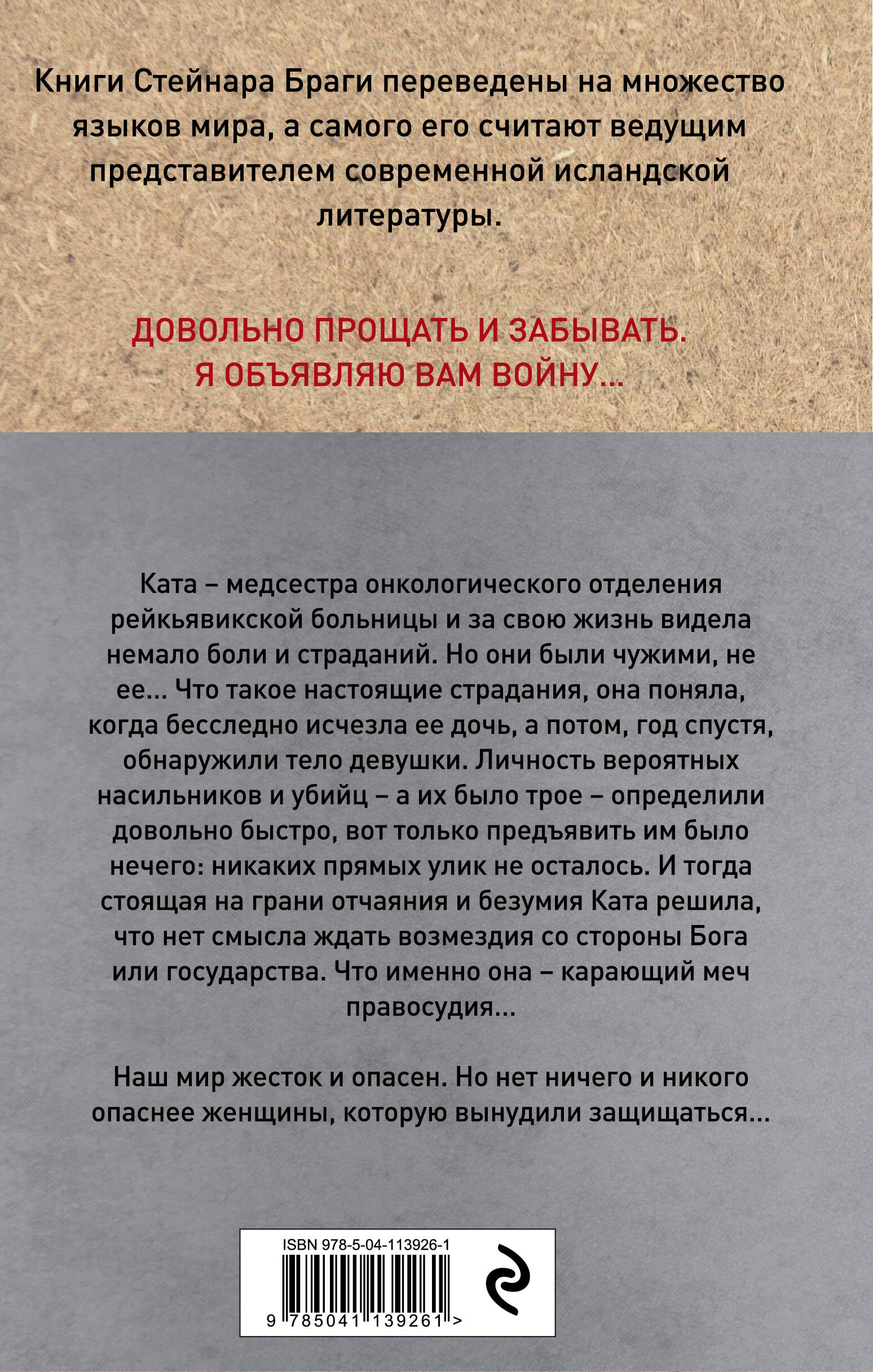ЛУЧШИЙ ИСЛАНДСКИЙ ТРИЛЛЕР 2014 ГОДА. Книги Стейнара Браги переведены на множество языков мира, а его самого считают ведущим представителем современной исландской литературы. Довольно прощать и забывать. Я объявляю вам войну… Ката - медсестра из онкологического отделения рейкьявикской больницы и за свою жизнь видела немало боли и страданий. Но они были чужими, не ее… Что такое настоящие страдания, она поняла, когда бесследно исчезла ее дочь, а потом, год спустя, обнаружили тело девушки. Личности вероятных насильников и убийц - а их было трое - определили довольно быстро, вот только предъявить им было нечего: никаких прямых улик не осталось. И тогда стоящая на грани отчаяния и безумия Ката решила, что нет смысла ждать возмездия со стороны Бога или государства. Что именно она - карающий меч правосудия… Наш мир жесток и опасен. Но нет ничего и никого опаснее женщины, которую вынудили защищаться… «Этот роман - параллель к социокритицизму Стига Ларссона». - Jyllands-Posten, Denmark «Да, Стейнар Браги отлично знает, как выразить насилие, направленное против женщин, и как показать механизмы мести». - Sydsvenskan, Sweden «Атмосфера романа - это «Твин Пикс»… Ката наказывает общество, приносящее в жертву насилию своих женщин. Око за око, как в древней исландской саге… Добро пожаловать в комнату страха - таков мир, в котором мы живем». - SVT, Sweden «Мощный роман… отправляющий читателя в путешествие, в котором не будет жалости ни для кого и ни для чего». - Morgunblaðið, Iceland| Издательство | ООО "Издательство "Эксмо" |