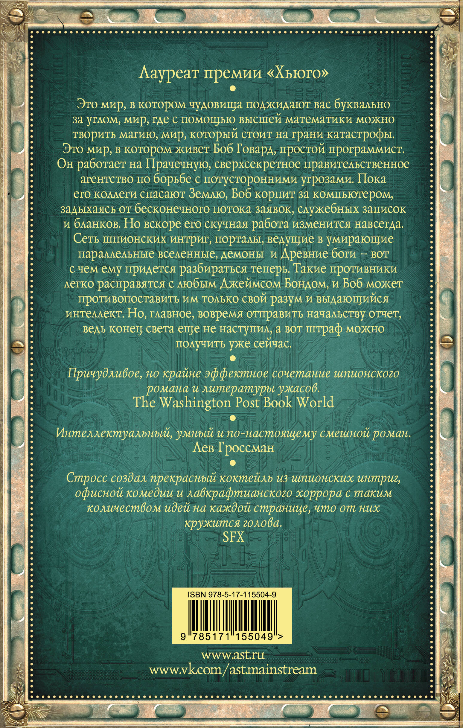 Это мир, в котором чудовища поджидают вас буквально за углом, мир, где c помощью высшей математики можно творить магию, мир, который стоит на грани катаст рофы. Это мир, в котором живет Боб Говард, простой программист. Он работает на Прачечную, сверхсекретное правительственное агентство по борьбе с потусторонними угрозами. Пока его коллеги спасают Землю, Боб корпит за компьютером, задыхаясь от бесконечного потока заявок, служебных записок и бланков. Но вскоре его скучная работа изменится навсегда. Сеть шпионских интриг, порталы, ведущие в умирающие параллельные вселенные, демоны и Древние боги - вот с чем ему придется разбираться теперь. Такие противники могут легко расправиться с любым Джеймсом Бондом, и Боб может противопоставить им только свой разум и выдающийся интеллект. Но, главное, вовремя отправить начальству от чет, ведь конец света еще не наступил, а вот штраф можно получить уже сейчас.| Издательство | ИЗДАТЕЛЬСТВО "АСТ" |