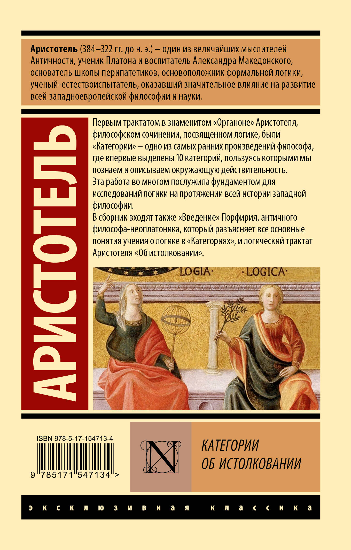 Аристотель (384-322 до н.э.) - один из величайших мыслителей Античности, ученик Платона и воспитатель Александра Македонского, основатель школы перипатетиков, основоположник формальной логики, ученый-естествоиспытатель, оказавший значительное влияние на развитие всей западноевропейской философии и науки. Первым трактатом в знаменитом "Органоне" Аристотеля, философском сочинении, посвященном логике, были "Категории" - одно из самых ранних произведений философа, где впервые выделены 10 категорий, пользуясь которыми мы познаем и описываем окружающую действительность. Эта работа во многом послужила фундаментом для исследований логики на протяжении всей истории западной философии. В сборник входят также "Введение" Порфирия, античного философа-неоплатоника, который разъясняет все основные понятия учения о логике в "Категориях", и логический трактат Аристотеля "Об истолковании".| Издательство | ИЗДАТЕЛЬСТВО "АСТ" |