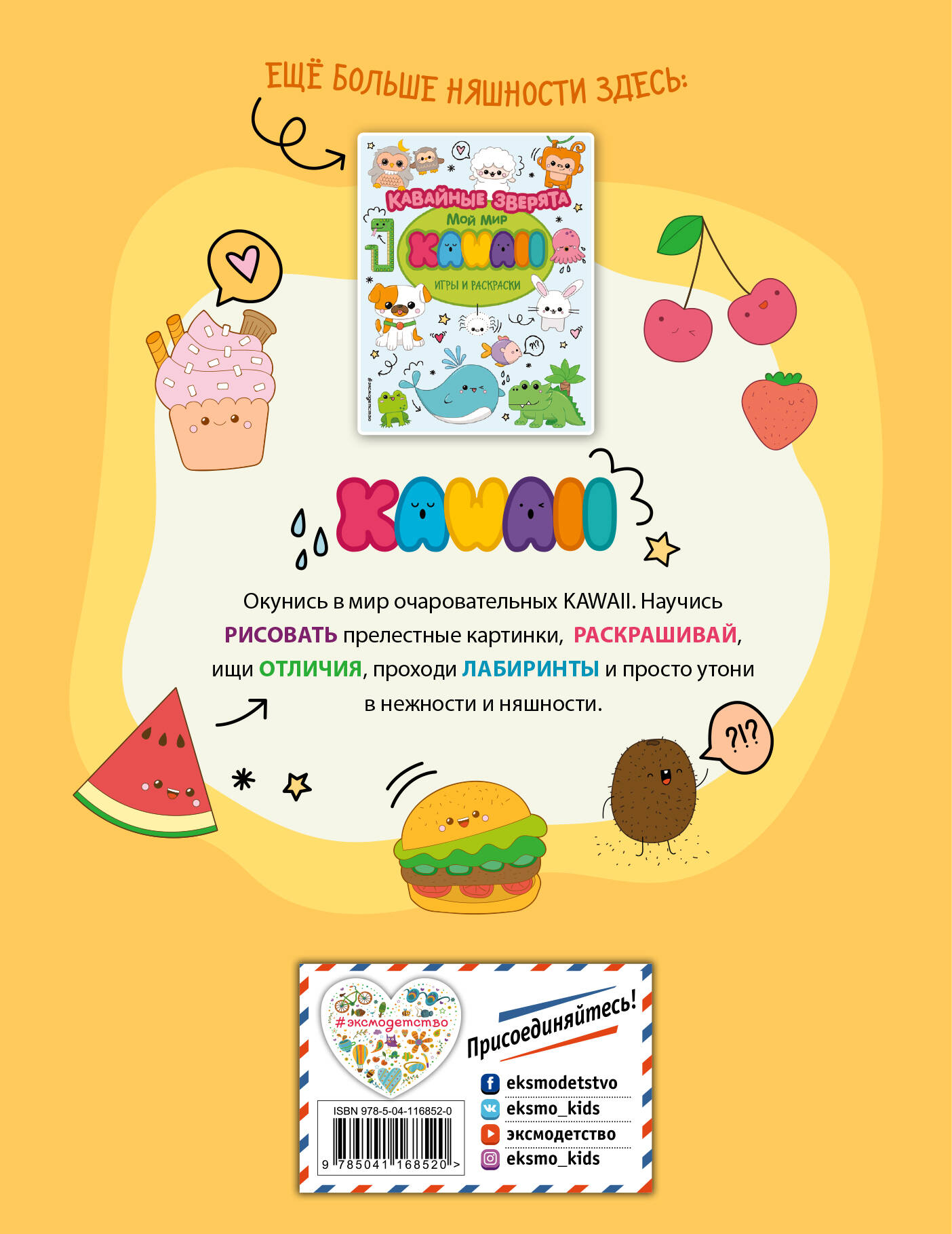 Добро пожаловать в мир обворожительных пироженок и компании! Окунись в мир очаровательных KAWAII. Научись рисовать прелестные картинки, раскрашивай, ищи отличия, проходи лабиринты, находи пары и просто утони в нежности и няшности. Эта книга - 2 в 1! Она дарит тебе не только набор увлекательных игр, но вместе с ней порцию кавайного настроения и мимишного уюта.
