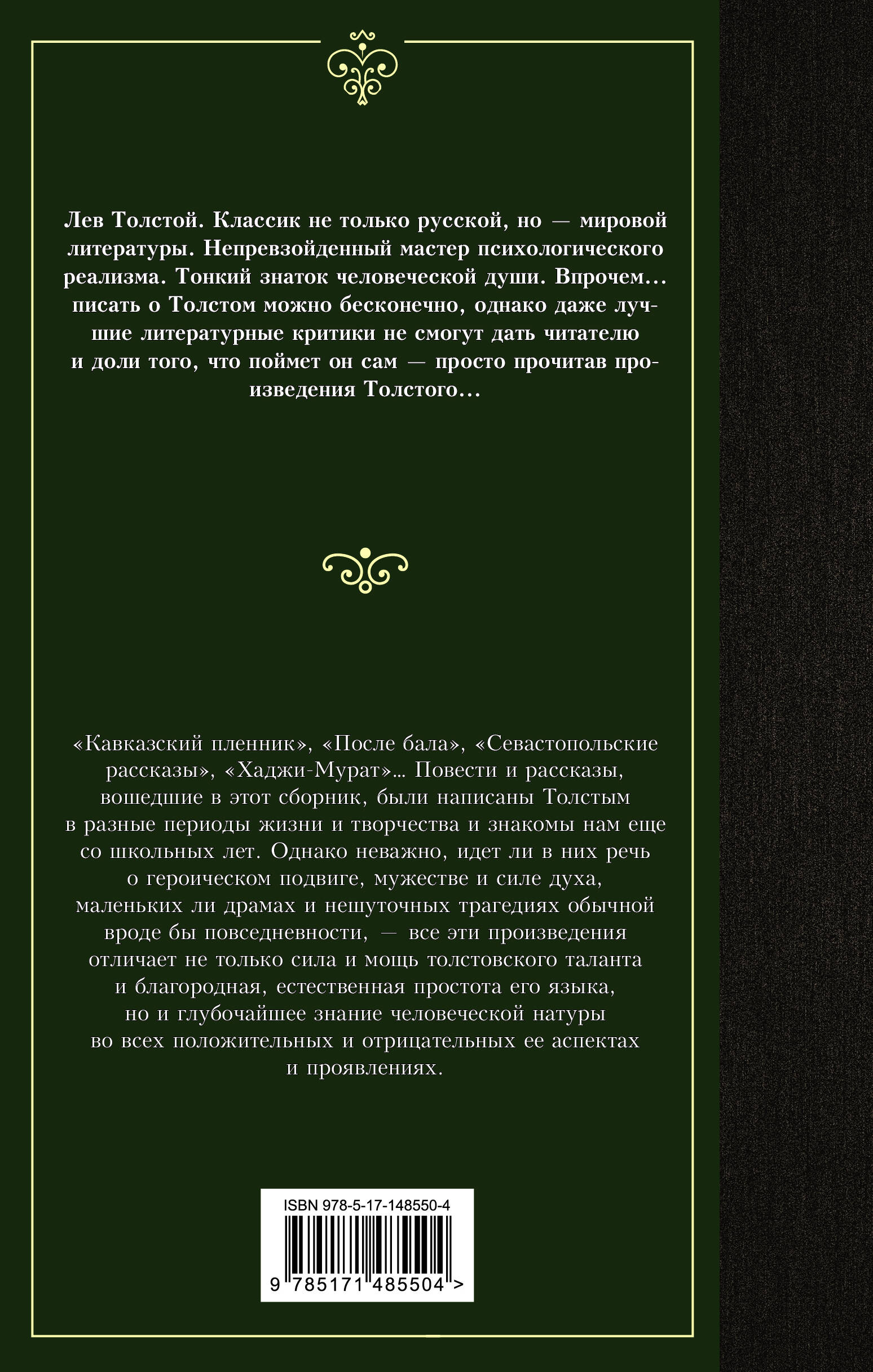 "Кавказский пленник", "После бала", "Севастопольские рассказы", "Хаджи-Мурат"... Повести и рассказы, вошедшие в этот сборник, были написаны Толстым в разные периоды жизни и творчества и знакомы нам еще со школьных лет. Однако неважно, идет ли в них речь о героическом подвиге, мужестве и силе духа, маленьких ли драмах и нешуточных трагедиях обычной вроде бы повседневности, - все эти произведения отличает не только сила и мощь толстовского таланта и благородная, естественная простота его языка, но и глубочайшее знание человеческой натуры во всех положительных и отрицательных ее аспектах и проявлениях.| Издательство | АСТ |