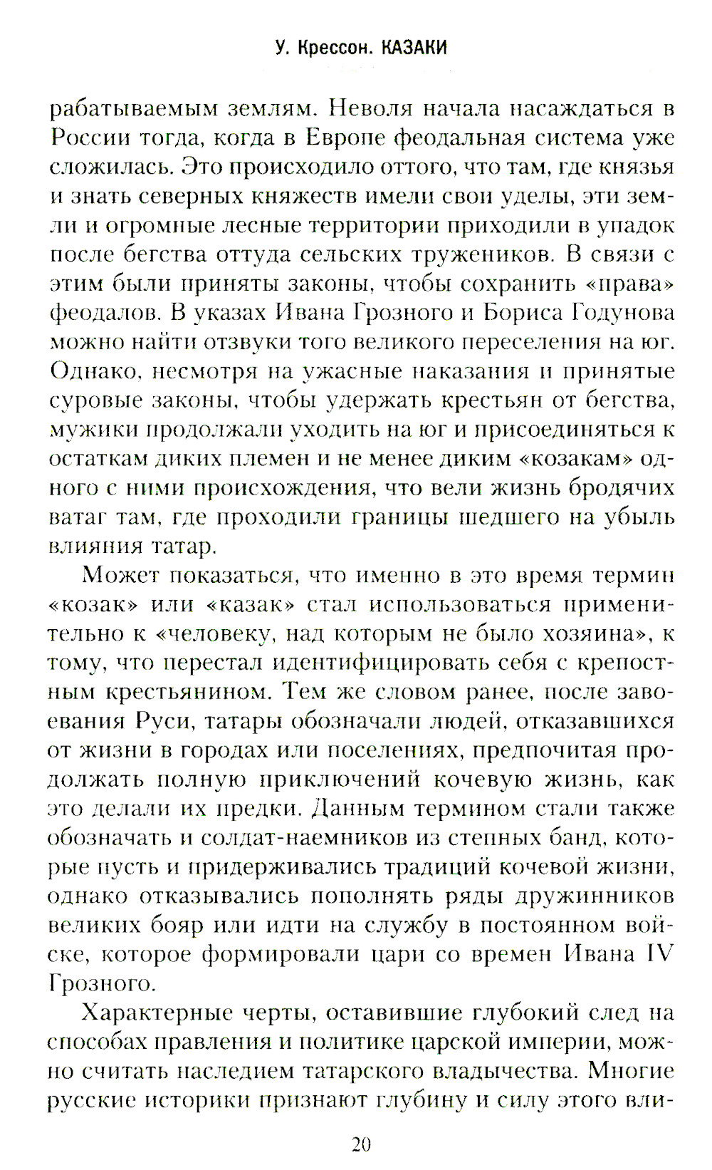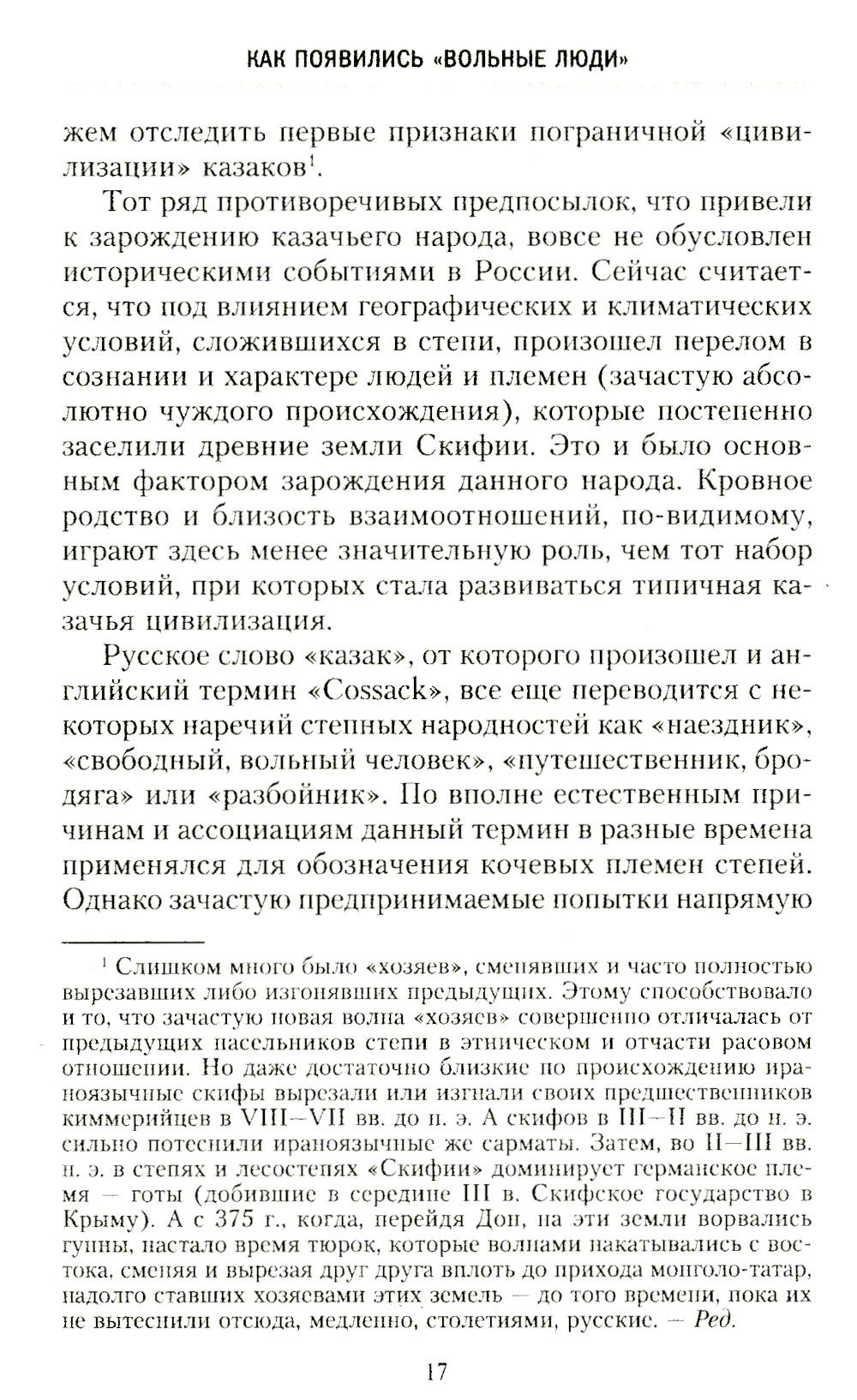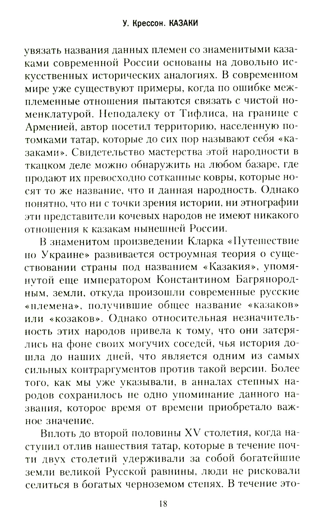 Уникальное исследование этнографа Уильяма Крессона посвящено истории казачества. Опираясь на труды историков, казачьи песни, сказания и легенды, автор рассматривает концепции возникновения этого русскоязычного субэтноса в донских и приднепровских степях, описывает быт, культуру, особенности несения службы в Донском и приграничных войсках. Отдельная глава посвящена Запорожской Сечи и ее вольнолюбивому братству. Автор мастерски передает историю написания запорожцами письма турецкому султану, послужившую сюжетом для знаменитой картины И.Е. Репина, и приводит само письмо - яркий образчик самобытного казачьего творчества. Повествование дополняют исторические портреты казачьих лидеров: покорителя Сибири Ермака, гетманов Богдана Хмельницкого и Ивана Мазепы, бунтовщика Емельяна Пугачева и героического атамана М.И. Платова. Особый интерес представляют очерки, посвященные казакам приграничья: кубанцам, терцам, гре€бенцам, астраханцам, уральцам и оренбуржцам.| Издательство | Центрполиграф |