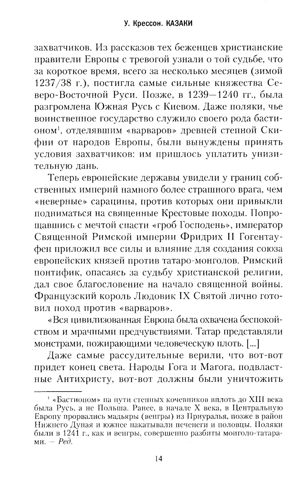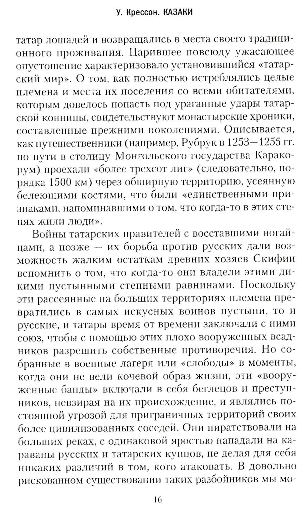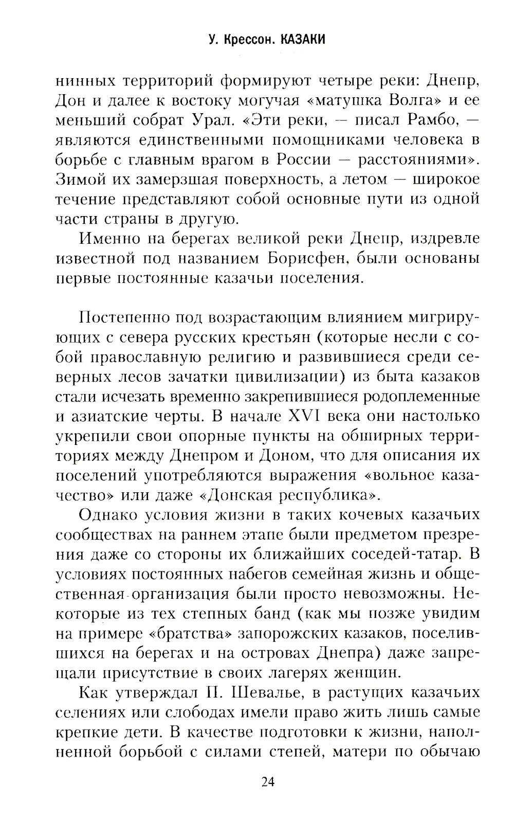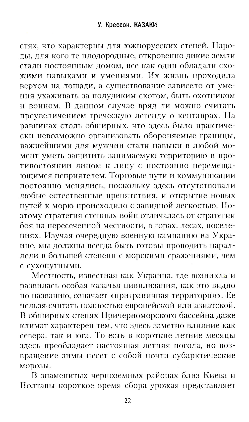 Уникальное исследование этнографа Уильяма Крессона посвящено истории казачества. Опираясь на труды историков, казачьи песни, сказания и легенды, автор рассматривает концепции возникновения этого русскоязычного субэтноса в донских и приднепровских степях, описывает быт, культуру, особенности несения службы в Донском и приграничных войсках. Отдельная глава посвящена Запорожской Сечи и ее вольнолюбивому братству. Автор мастерски передает историю написания запорожцами письма турецкому султану, послужившую сюжетом для знаменитой картины И.Е. Репина, и приводит само письмо - яркий образчик самобытного казачьего творчества. Повествование дополняют исторические портреты казачьих лидеров: покорителя Сибири Ермака, гетманов Богдана Хмельницкого и Ивана Мазепы, бунтовщика Емельяна Пугачева и героического атамана М.И. Платова. Особый интерес представляют очерки, посвященные казакам приграничья: кубанцам, терцам, гре€бенцам, астраханцам, уральцам и оренбуржцам.| Издательство | Центрполиграф |