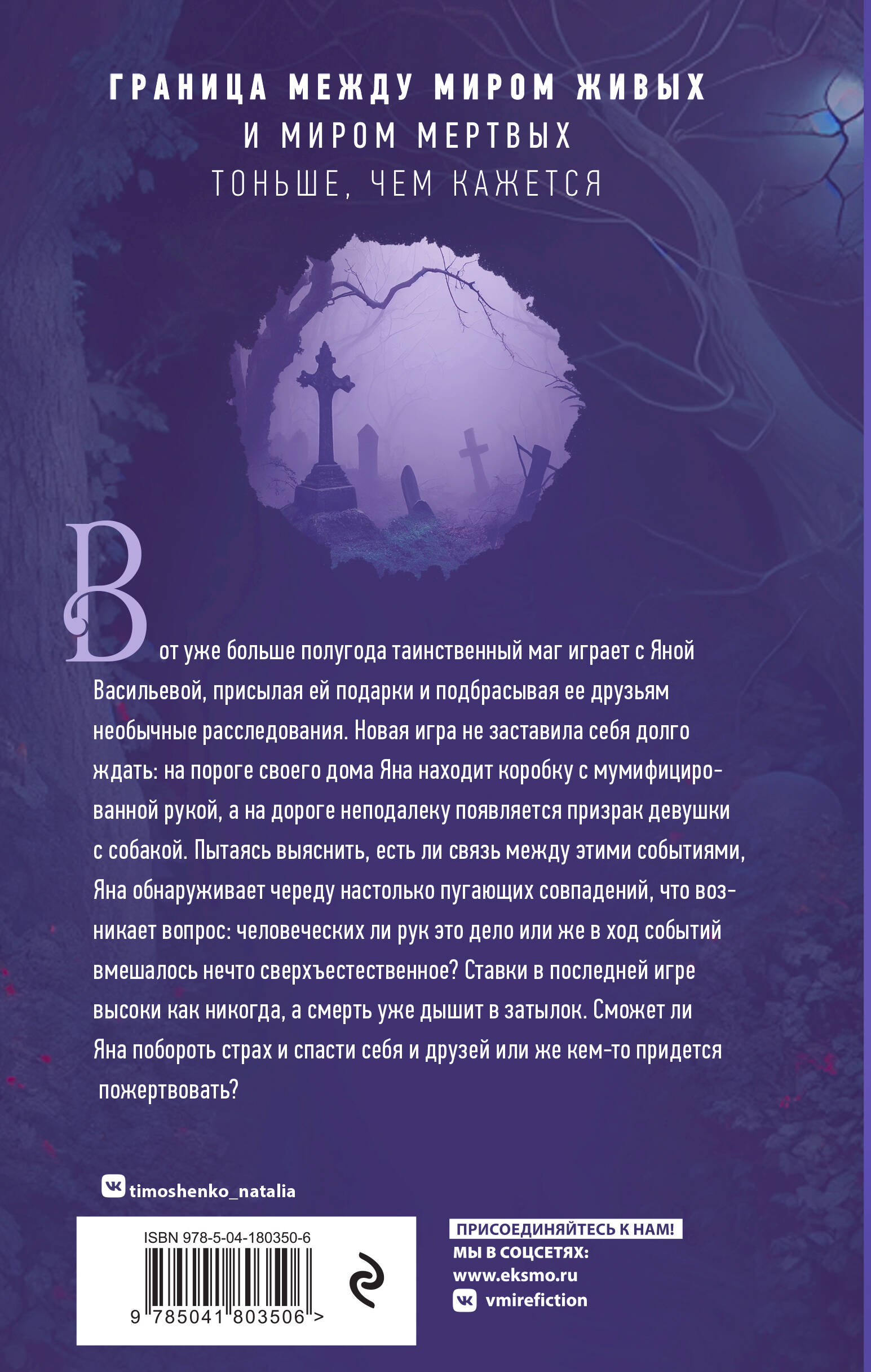 Пятый и финальный роман Натальи Тимошенко в цикле «Игры со смертью»! Вот уже больше полугода таинственный маг играет с Яной Васильевой, присылая ей подарки и подбрасывая ее друзьям необычные расследования. Новая игра не заставила себя долго ждать: на пороге своего дома Яна находит коробку с мумифицированной рукой, а на дороге неподалеку появляется призрак девушки с собакой. Пытаясь выяснить, если ли связь между этими событиями, Яна обнаруживает череду настолько пугающих совпадений, что возникает вопрос: человеческих ли рук это дело или же в ход событий вмешалось нечто сверхъестественное? Ставки в последней игре высоки как никогда, а смерть уже дышит в затылок. Сможет ли Яна побороть страх и спасти себя и друзей или же кем-то придется пожертвовать?| Издательство | ООО "Издательство "Эксмо" |