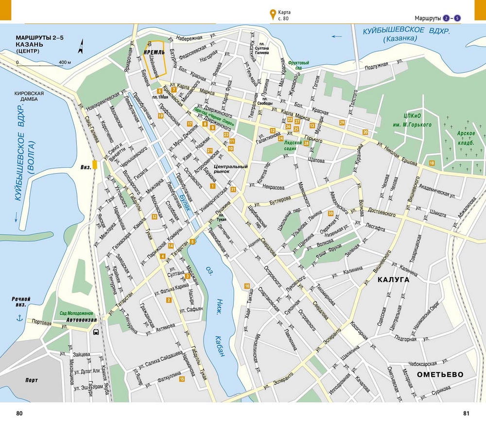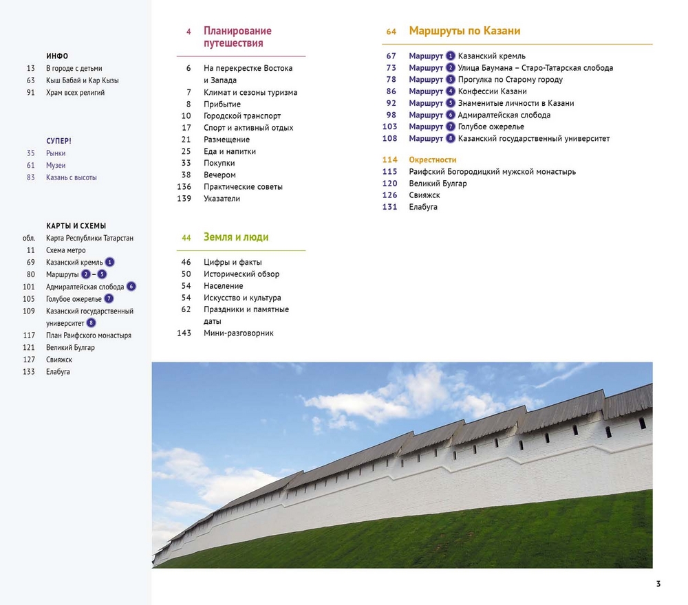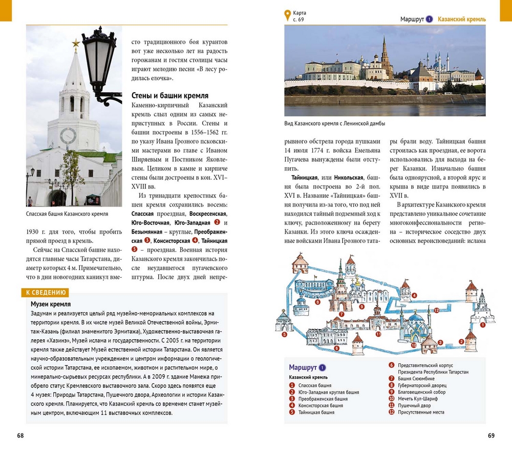 Впрочем, вы можете отправиться по любому из восьми предложенных в путеводителе маршруту и не ошибётесь: по центру города и Казанскому кремлю, по Старо-Татарской слободе и в окрестностях Казанского государственного университета. Обязательно запланируйте поездки Раифский Богородицкий мужской монастырь и в Елабугу, в Великий Булгар и Свияжск.