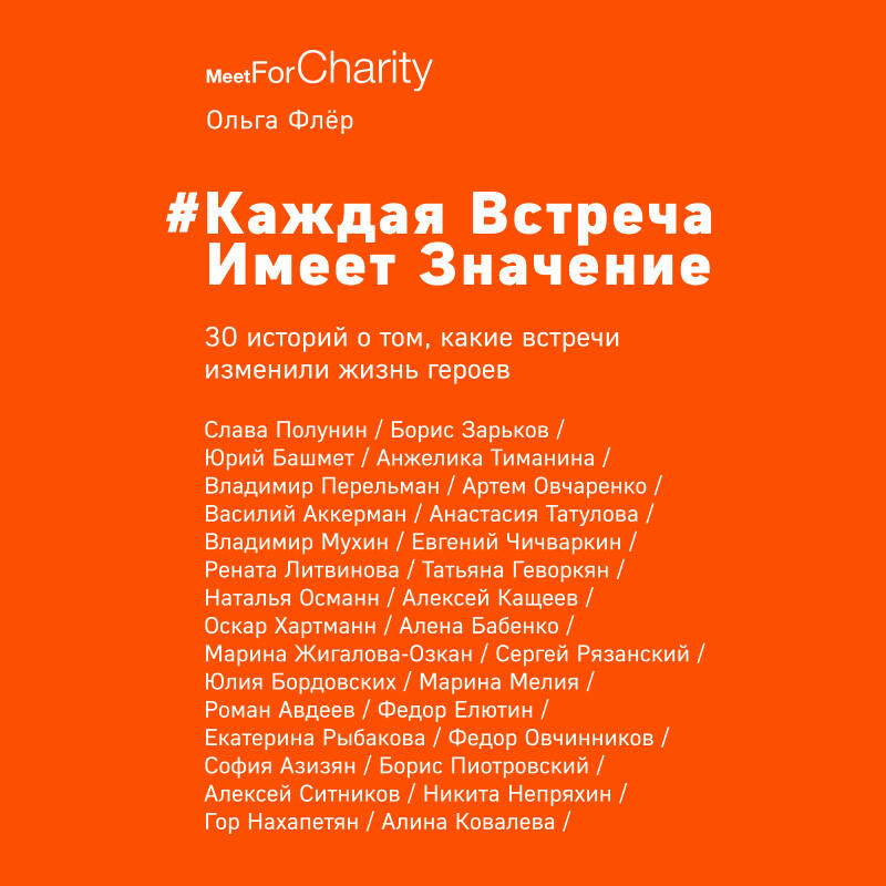 Вдохновляющие истории известных людей. Все герои давно добились успеха в своих областях. К их словам и мыслям прислушиваются миллионы людей. Об их жизни хотят узнать многие. В том числе о знаковых для этих героев моментах - встречах, изменивших судьбу. В книгу Ольга Флер вошли рассказы разных людей - бизнесменов, артистов, актеров театра и кино, рестораторов, деятелей науки, журналистов, писателей и многих других. Это книга про благородные дела и хорошие поступки. Ведь идея издания связана с другим проектом автора - Meet For Charity (MFC), который помогает многим благотворительным фондам и объединяет неравнодушных людей. Именно так участники Meet For Charity стали героями книги Ольги Флер.| Издательство | ООО "Издательство "Эксмо" |