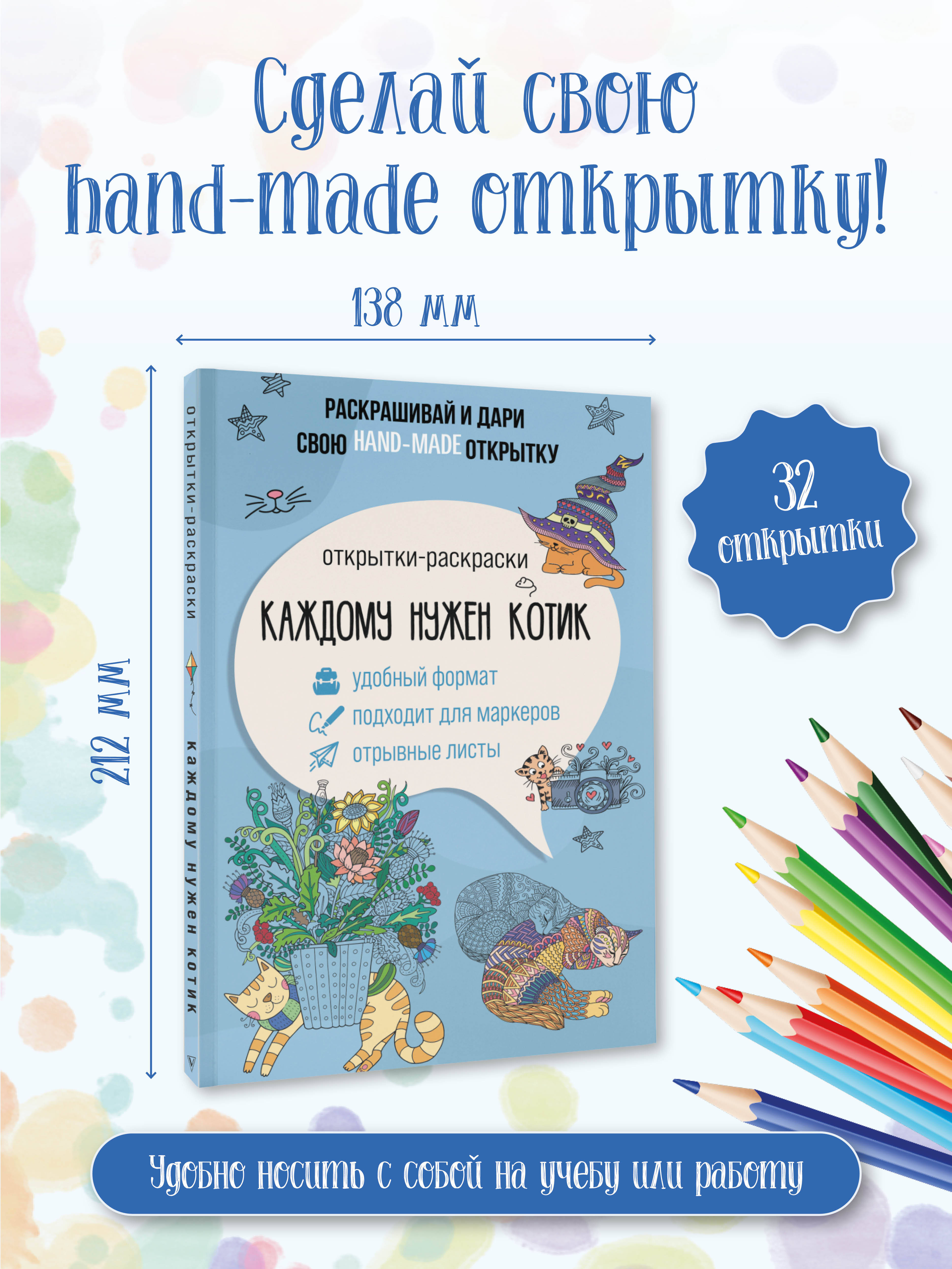 Каждому нужен котик. И теперь это так просто. Замурррчательные питомцы удобно расположились на страницах раскраски «Каждому нужен котик». Отрывные листы и твердая подложка для рисования - все для комфортного создания hand-made открыток. Просто раскрасьте пушистого котика и подарите его другу!| Издательство | Издательство "АСТ" |
