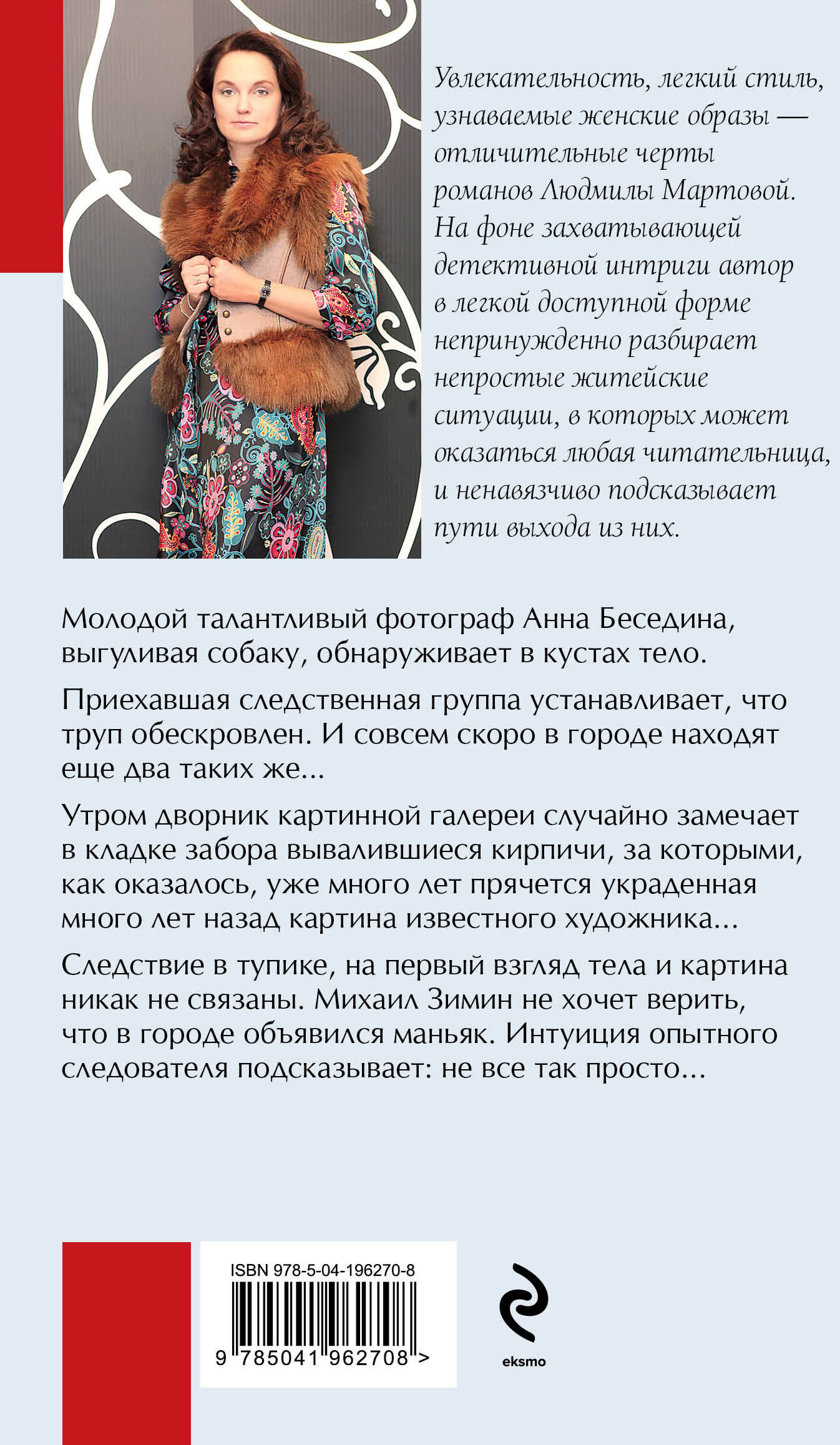 В тихом уютном городе происходит ряд неожиданных событий. Ночью в сквере найден молодой человек, полностью обескровленный. А утром совсем недалеко от того места обнаружили украденную много лет назад картину известного художника. Но это, оказывается, только верхушка айсберга. Что на самом деле произошло? С этим придется разобраться следователю Михаилу Зимину и фотографу Анне Бесединой. Увлекательность, легкий стиль, узнаваемые женские образы - отличительные черты романов Людмилы Мартовой. На фоне захватывающей детективной интриги автор в легкой доступной форме непринужденно разбирает непростые житейские ситуации, в которых может оказаться любая читательница, и ненавязчиво подсказывает пути выхода из них.| Издательство | ООО "Издательство "Эксмо" |