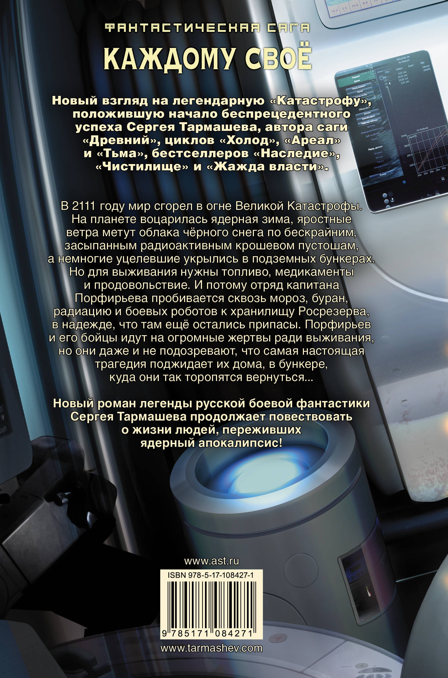 «Каждому своё 3» - новая часть нового эпоса Сергея Тармашева, известного писателя-фантаста, автора знаменитых циклов «Древний», «Холод» и «Ареал», - настоящий подарок для всех поклонников и ценителей захватывающей постапокалиптической литературы и годного фантастического боевика. 2111 год. Мир разрушен войной. После обмена ядерными ударами человеческая цивилизация пришла в упадок. Солнце закрыли облака радиоактивной пыли. Заражённые воздух и вода стали смертельны для людей. Мир находится в состоянии постоянного военного положения. Не осталось ни знакомых стран, ни городов. Немногие уцелевшие скрылись в подземных бункерах. Но для существования бункера нужны припасы, топливо и медикаменты. Поэтому группа капитана Порфирьева уходит в поход на хранилища Росрезерва. Они идут к своей цели сквозь адский холод, буран и радиацию. Они рискуют нарваться на вооружённые группы других уцелевших или на боевых роботов НАТО. Любая задержка или поломка грозит гибелью. Но они ещё и не подозревают, что самый неприятный сюрприз поджидает их дома, где кучка недовольных методами полковника Брилёва террористов устраивает настоящий мятеж… Новый роман легенды русской боевой фантастики Сергея Тармашева продолжает повествовать о жизни людей, переживших ядерный апокалипсис!| Издательство | Издательство "АСТ" |