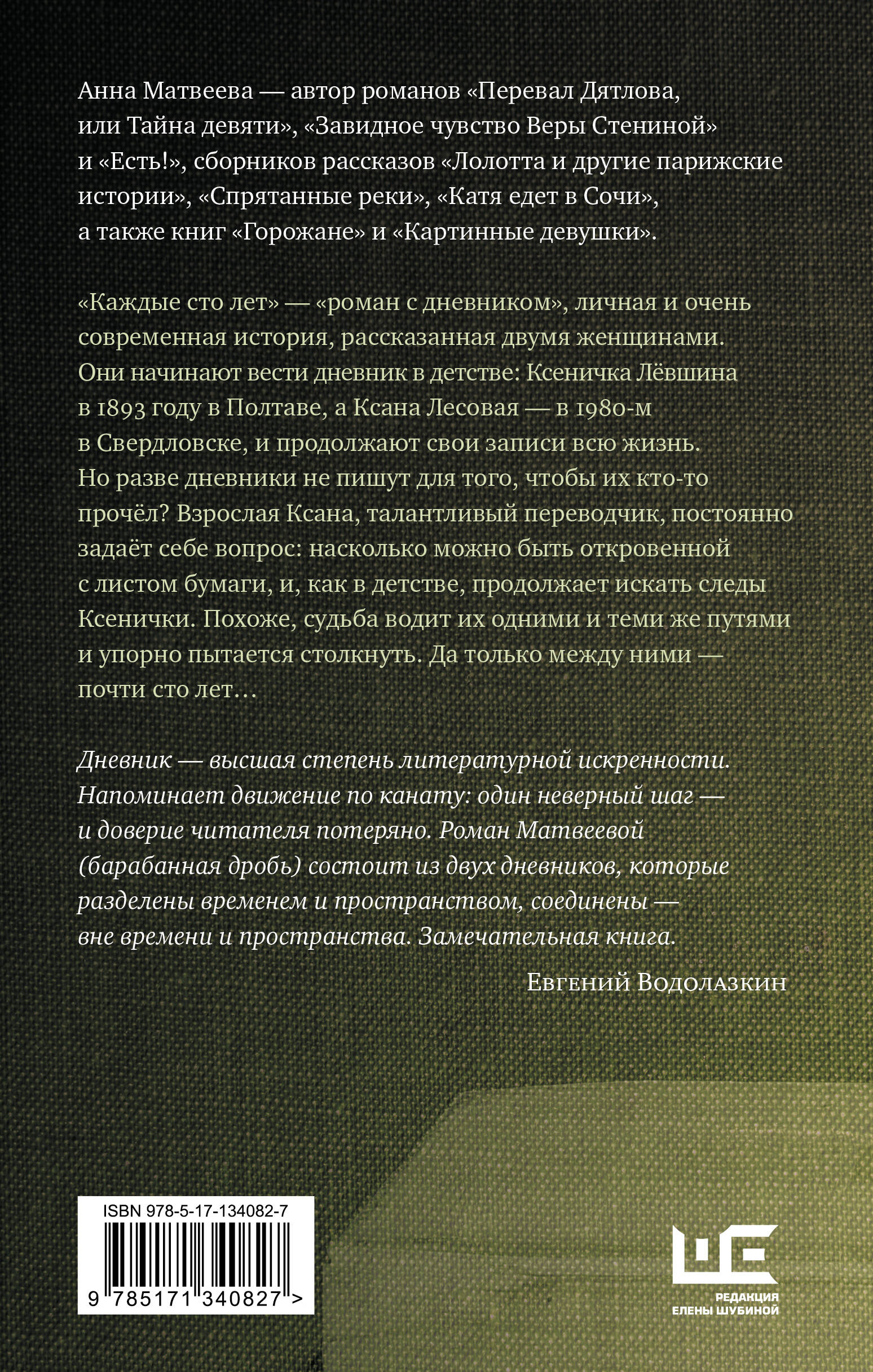 «Каждые сто лет» - призер премии «Большая книга» в номинации «Читательское голосование». Многоуровневый роман, построенный на дневниковых записях и рассказах о двух героинь, разделенных временем, но связанных не всегда очевидными, но схожими поворотами судьбы. Размышление о женщине - ее личной истории и возможностях изменить собственную судьбу. Роман с дневником - возможность услышать внутренний голос персонажей, посмотреть на них со стороны и одновременно прожить вместе с ними их судьбу. Удивительно образный язык Анны Матвеевой затрагивает все типы восприятия, создавая перед внутренним взором читателя почти кинематографическую картину. Анна Матвеева - известный прозаик, автор бестселлера «Перевал Дятлова», дважды финалист премии «Большая книга» и «Премии Ивана Петровича Белкина», лауреат премии «Lo Stellato» (Италия). Ее книги переведены на множество иностранных языков.