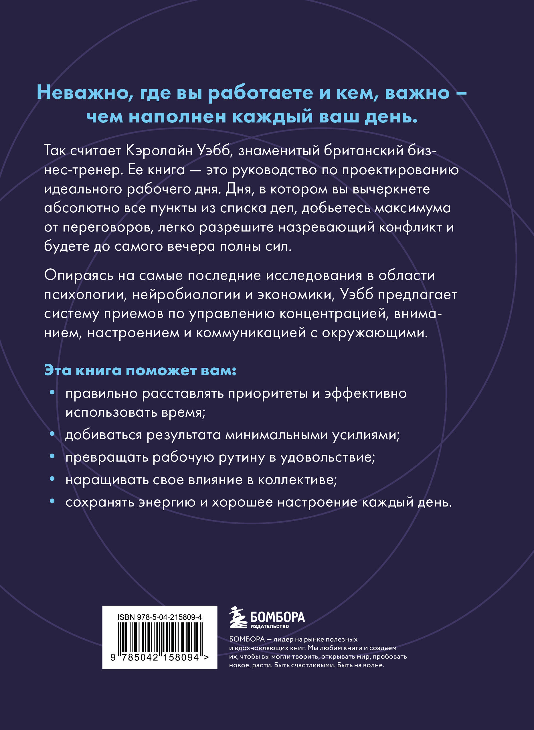 Не важно, где вы работаете и кем, важно - чем наполнен каждый ваш день. Так считает Кэролайн Уэбб, знаменитый британский бизнес-тренер. Ее книга - это руководство по проектированию идеального рабочего дня. Дня, в котором вы вычеркнете абсолютно все пункты из списка дел, добьётесь максимума от переговоров, легко разрешите назревающий конфликт и будете до самого вечера полны сил. Опираясь на самые последние исследования в области психологии, нейробиологии и экономики, Уэбб предлагает систему приемов по управление концентрацией, вниманием, настроением и коммуникацией с окружающими. Эта книга поможет вам: 1. Правильно расставлять приоритеты и эффективно использовать время. 2. Добиваться результата минимальными усилиями. 3. Превращать рабочую рутину в удовольствие. 4. Наращивать свое влияние в коллективе. 5. Сохранять энергию и хорошее настроение каждый день.| Издательство | ООО "Издательство "Эксмо" |