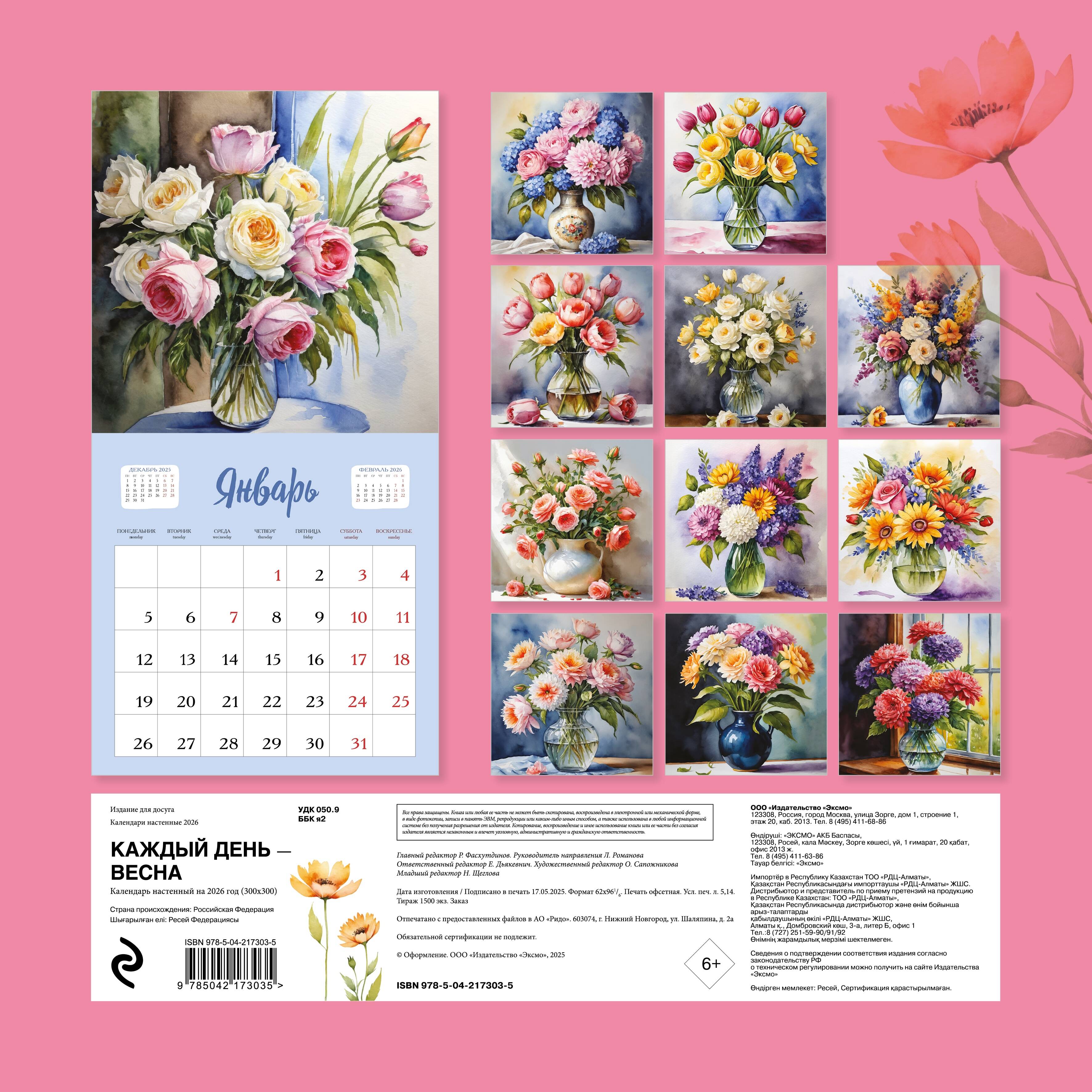 «Каждый день - весна» - источник вдохновения на целый год. Нежные акварельные букеты на каждой странице превращают будни в праздник, приносят в дом атмосферу уюта, тепла и гармонии. Каждое изображение - как дыхание весны. Этот календарь станет прекрасным украшением интерьера, напоминанием о красоте момента и идеальным подарком для тех, кто ценит изящное искусство и уют в деталях.| Издательство | ООО "Издательство "Эксмо" |