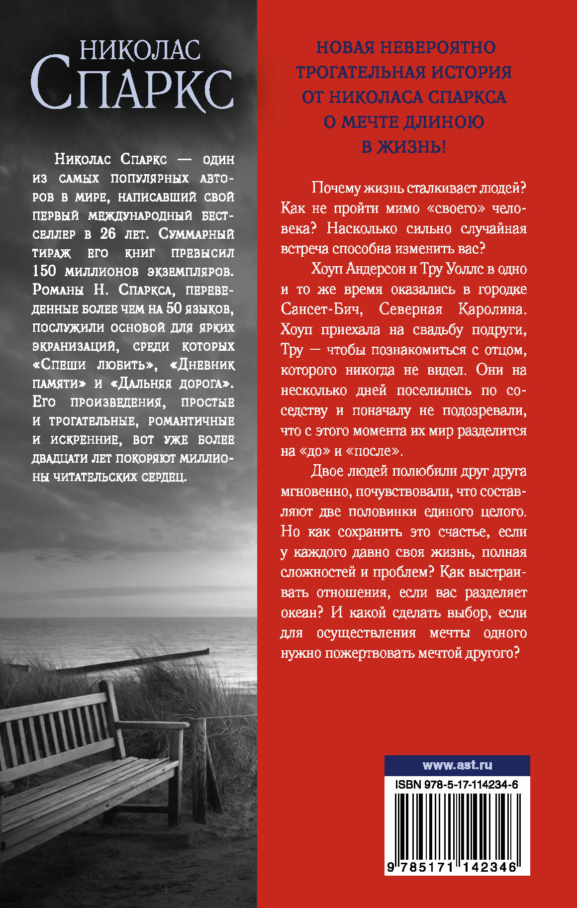Почему жизнь сталкивает людей? Как не пройти мимо "своего" человека? Насколько сильно случайная встреча способна изменить вашу жизнь? Хоуп Андерсон и Тру Уоллс в одно и то же время оказались в городке Сансет-Бич, Северная Каролина. Хоуп приехала на свадьбу подруги, Тру - чтобы познакомиться с отцом, которого никогда не видел. Они на несколько дней поселились по соседству и поначалу не подозревали, что с этого момента их мир разделится на "до" и "после". Двое людей полюбили друг друга мгновенно, почувствовали, что составляют две половинки единого целого. Но как сохранить это счастье, если у каждого давно своя жизнь, полная сложностей и проблем? Как выстраивать отношения, если вас разделяет океан? И какой сделать выбор, если для осуществления мечты одного, нужно пожертвовать мечтой другого?| Издательство | ИЗДАТЕЛЬСТВО "АСТ" |