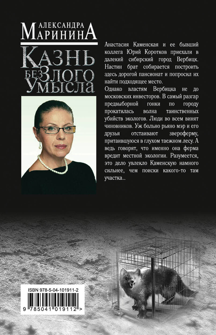 Анастасия Каменская и ее бывший коллега Юрий Коротков приехали в далекий сибирский город Вербицк. Настин брат собирается построить здесь дорогой пансионат и попросил их найти подходящее место. Однако, властям Вербицка не до московских инвесторов. В самый разгар предвыборной гонки по городу прокатилась волна таинственных убийств экологов. Люди во всем винят чиновников. Уж больно рьяно мэр и его друзья отстаивают звероферму, притаившуюся в глухом таежном лесу. А ведь говорят, что именно она - ферма - вредит местной экологии. Разумеется, это дело увлекло Каменскую намного сильнее, чем поиски какого-то там участка… -------------------------------------------------- «Маринина не только пишет детективные романы, но и отвечает на вечные вопросы. Автор относится к своим читателям как добрый и опытный учитель к ученикам, которые нуждаются в поддержке, подсказке и направлении на верный путь. Оптимистичная и практичная в своей дидактике, Маринина ставит перед собой вопрос "как жить" и старается помочь читателю найти свой путь к лучшей жизни в сегодняшнем мире. Своими детективами Маринина пишет современный роман "воспитания чувств": основная цель автора - воспитание посредством развлечения». - Анатолий Вишевский, Гринелльский колледж, США «Многие романы Александры Марининой в России экранизированы, а в Германии переработаны в радиопьесы. Исходя из того, что цель этих обработок - захватывать зрителей и слушателей таким же образом, как захвачены читатели, то фильм и радиопьеса являются не только дополнительными художественными произведениями, но и интересными интерпретациями, которые проникли в тайну успеха Александры Марининой». - Сара Хэги, Кельнский университет, Германия «В диалогах художественной и тривиальной литературы можно обнаружить разные способы стилизации "устности", чтобы достичь впечатления спонтанного разговора. Обиходная речь в романах А. Марининой отличается необыкновенно высокой степенью оживленности, что выражается, между прочим, в разных формах обращения собеседников, в различных оттенках вежливости и в эмоциональности используемой лексики». - Вольфганг Штадлер, Университет имени Леопольда Францена, Инсбрук, Австрия.| Издательство | ООО "Издательство "Эксмо" |