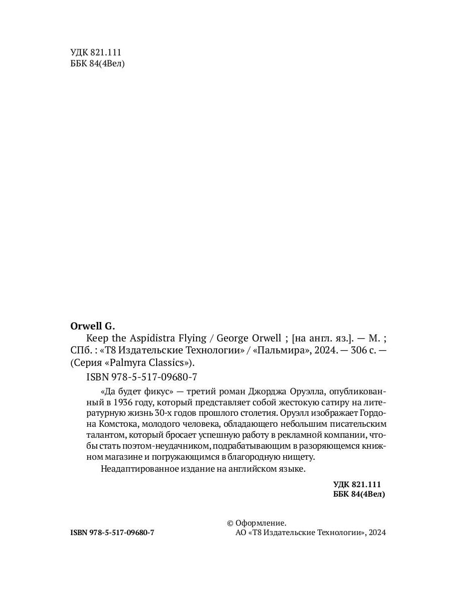 "Да будет фикус" - третий роман Джорджа Оруэлла, опубликованный в 1936 году, который представляет собой жестокую сатиру на литературную жизнь 30-х годов прошлого столетия. Оруэлл изображает Гордона Комстока, молодого человека, обладающего небольшим писательским талантом, который бросает успешную работу в рекламной компании, чтобы стать поэтом-неудачником,подрабатывающим в разоряющемся книжном магазине и погружающимся в благородную нищету. Неадаптированное издание на английском языке.