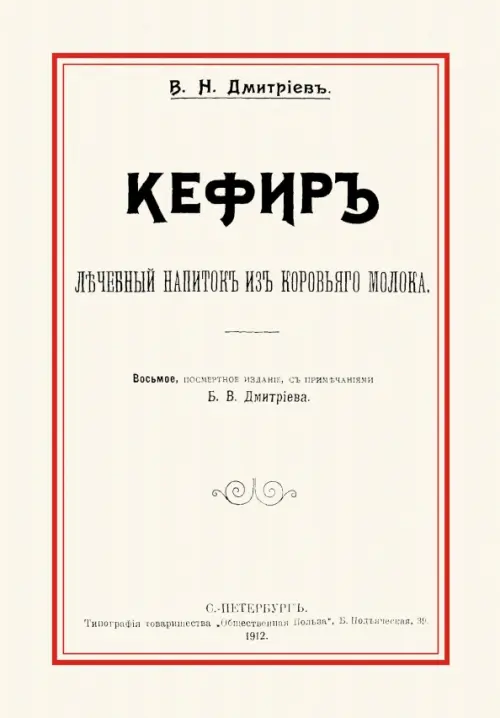 Репринт с 8-го издания. С примеч. Б. В. Дмитриева, посмертное издание. Санкт-Петербург, тип. т-ва "Обществ. польза", 1912. Технология изготовления, лечебное значение, способы приготовления и употребления кефира, литература о кефире. Книга изготовлена по технологии "печать по требованию". Тираж 30 экз.