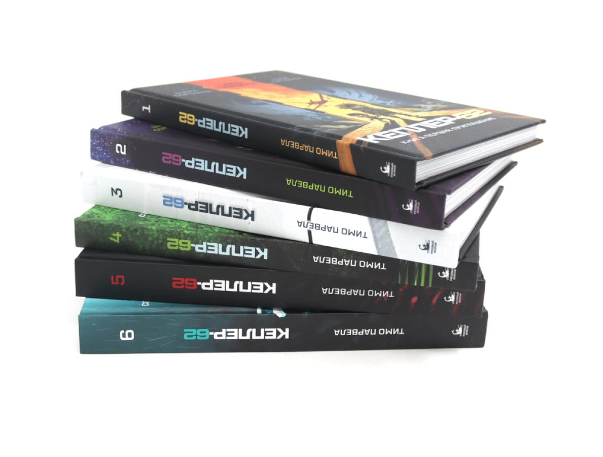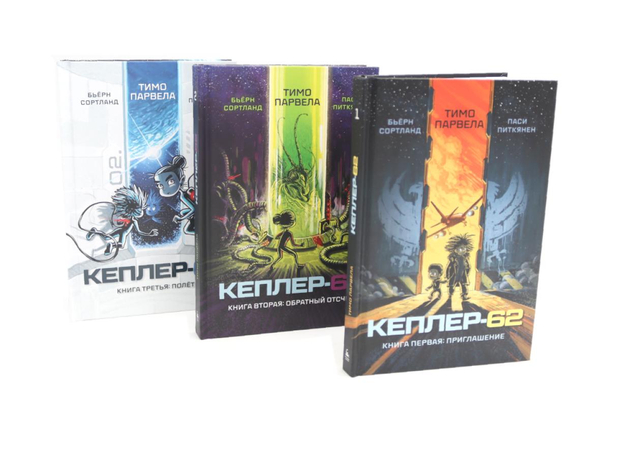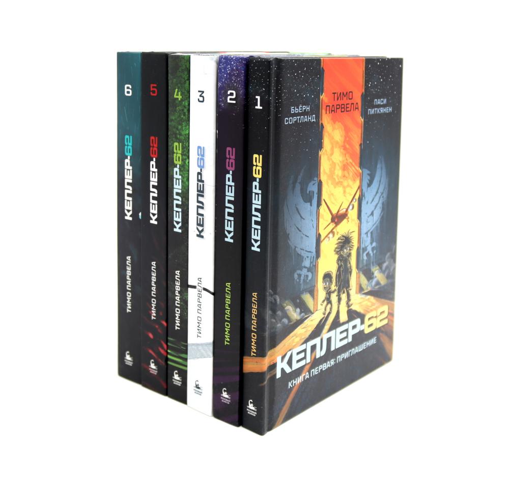 Комплект из 6 книг: «Кеплер-62. Книга первая: приглашение» Земной шар перенаселён, природные ресурсы стремительно истощаются. Тринадцатилетний Ари заботится о своем младшем брате Йони, пока их мама пытается найти хоть какую-нибудь работу. Мальчики вместе играют в новую компьютерную игру «Кеплер-62», которую никому не удаётся пройти до конца. Ходят слухи, что победителя, добравшегося до последнего уровня, ждёт какая-то особенная награда. Но никто не знает, какая. Да и правда ли, что это всего лишь игра? «Кеплер-62. Книга вторая: обратный отсчет» Мало кому удаётся преодолеть все уровни в компьютерной игре «Кеплер-62». Мари, дочь богатого промышленника, нанимает трёх геймеров, чтобы они помогли ей пройти игру до конца. Наградой за выигрыш оказывается участие в космической экспедиции. Загадочная организация OTNSPCFRVR собирается отправить подростков в космос, чтобы они исследовали планетную систему Кеплер-62. Но что будет, если отказаться от участия в этой миссии? Писатели Тимо Парвела и Бьёрн Сортланд с художником Паси Питкяненом создали захватывающий мир, где дружба проходит испытание в далёком космосе. «Обратный отсчёт» - вторая из шести книг серии. «Кеплер-62. Книга третья: полёт» Земля находится на краю гибели. Последняя надежда - космическая экспедиция на далекую планету Кеплер-62, куда отправляется команда специально подготовленных подростков. Что ждет их на пути длиной 1200 световых лет? Кто или что находится в дополнительной тринадцатой капсуле? И смогут ли очнувшиеся от гиперсна Ари и Мари предотвратить катастрофу? Писатели Тимо Парвела, Бьёрн Сортланд и художник Паси Питкянен создали захватывающую эпопею, где дружба проходит испытание в далёком космосе. «Кеплер-62. Книга четвёртая: первопроходцы» В четвертой книге экспедиция наконец прибывает на Кеплер-62е. Дивный зеленый мир, полный жизни, открывается перед путешественниками. Но их радость омрачена потерей четырех товарищей - один из кораблей не достиг цели. Кроме того, у Йони снова обострилась его болезнь. Мари и Ари, объединенные общей тайной, чувствуют себя в стороне от остальных. Им удается вступить в контакт с существами, обитающими на Кеплере-62е, но можно ли доверять этим существам? Писатели Тимо Парвела, Бьёрн Сортланд и художник Паси Питкянен создали захватывающую эпопею, где дружба проходит испытание в далёком космосе. «Кеплер-62. Книга пятая: вирус» Природа на новой планете таит для много сюрпризов. Ари и Мари обнаруживают закодированное сообщение, отправленное странным космическим зондом. Кроме того они замечают, что кое-кто из участников экспедиции знает гораздо больше остальных. Писатели Тимо Парвела, Бьёрн Сортланд и художник Паси Питкянен создали захватывающую эпопею, где дружба проходит испытание в далёком космосе. «Кеплер-62. Книга шестая: тайна» Участников экспедиции охватывает паника. Склад с оружием пуст, а противоядие исчезло. За всем стоит таинственный обитатель лишней капсулы, а его личность оказывается неожиданностью для всех. В чем цель миссии «Kepler-62»? Секреты раскрываются один за другим. Писатели Тимо Парвела, Бьёрн Сортланд и художник Паси Питкянен создали захватывающую эпопею, где дружба проходит испытание в далёком космосе.| Издательство | Розовый жираф |