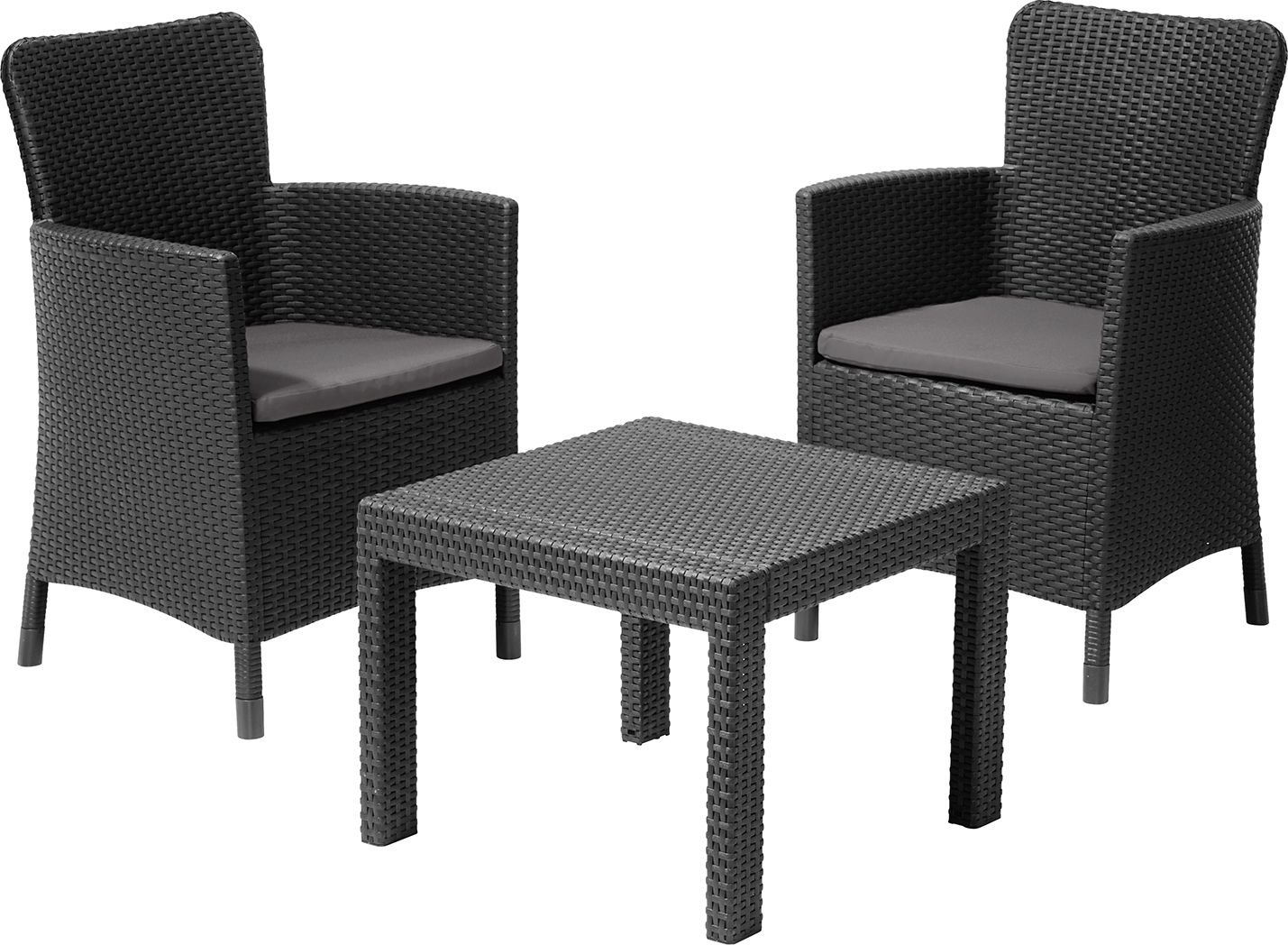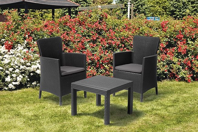 Salvador - это набор с текстурой поверхности из ротанга, в который входят два кресла и квадратный стол. Эргономичные спинки и мягкие кресла с подушками сделают приятным каждый момент отдыха на свежем воздухе. Мебельный гарнитур, который легко чистится, устойчив к неблагоприятным погодным условиям и УФ-лучам. Доступен в классической цветовой палитре.