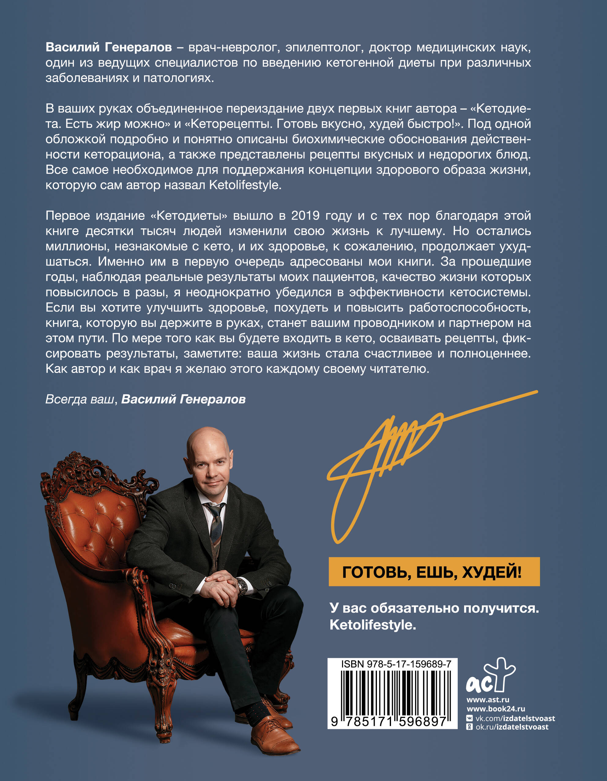 Василий Генералов - врач-невролог, эпилептолог, доктор медицинских наук, один из ведущих специалистов по введению кетогенной диеты при различных заболеваниях и патологиях. В ваших руках объединенное переиздание двух первых книг автора - "Кетодиета. Есть жир можно!" и "Кеторецепты. Готовь вкусно, худей быстро!". Под одной обложкой подробно и понятно описаны биохимические обоснования действенности кеторациона, а также представлены рецепты вкусных и недорогих блюд. Все самое необходимое для поддержания концепции здорового образа жизни, которую сам автор назвал Ketolifestyle. Первое издание "Кетодиеты" вышло в 2019 году, и с тех пор благодаря этой книге десятки тысяч людей изменили свою жизнь к лучшему. Но остались миллионы, не знакомые с кето, и их здоровье, к сожалению, продолжает ухудшаться. Именно им, в первую очередь, адресованы мои книги. За прошедшие годы, наблюдая реальные результаты моих пациентов, качество жизни которых повысилось в разы, я неоднократно убедился в эффективности кетосистемы. Если вы хотите улучшить здоровье, похудеть и повысить работоспособность, - книга, которую вы держите, станет вашим проводником и партнером на этом пути. По мере того как вы будете входить в кето, осваивать рецепты, фиксировать результаты, заметите: ваша жизнь стала счастливее и полноценнее. Как автор и как врач я желаю этого каждому своему читателю.| Издательство | Издательство "АСТ" |